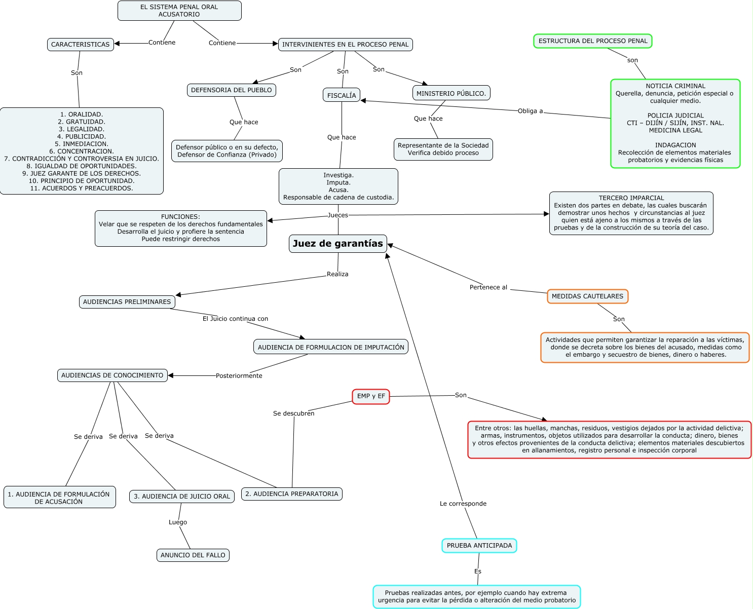 Este Cmap, tiene información relacionada con: SISTEMA PENAL ACUSATORIO, Investiga. Imputa. Acusa. Responsable de cadena de custodia. Jueces Juez de garantías, ESTRUCTURA DEL PROCESO PENAL son NOTICIA CRIMINAL Querella, denuncia, petición especial o cualquier medio. POLICIA JUDICIAL CTI – DIJÍN / SIJÍN, INST. NAL. MEDICINA LEGAL INDAGACION Recolección de elementos materiales probatorios y evidencias físicas, 3. AUDIENCIA DE JUICIO ORAL Luego ANUNCIO DEL FALLO, NOTICIA CRIMINAL Querella, denuncia, petición especial o cualquier medio. POLICIA JUDICIAL CTI – DIJÍN / SIJÍN, INST. NAL. MEDICINA LEGAL INDAGACION Recolección de elementos materiales probatorios y evidencias físicas Obliga a FISCALÍA, AUDIENCIAS DE CONOCIMIENTO Se deriva 1. AUDIENCIA DE FORMULACIÓN DE ACUSACIÓN, PRUEBA ANTICIPADA Le corresponde Juez de garantías, INTERVINIENTES EN EL PROCESO PENAL Son MINISTERIO PÚBLICO., PRUEBA ANTICIPADA Es Pruebas realizadas antes, por ejemplo cuando hay extrema urgencia para evitar la pérdida o alteración del medio probatorio, INTERVINIENTES EN EL PROCESO PENAL Son FISCALÍA, AUDIENCIAS DE CONOCIMIENTO Se deriva 2. AUDIENCIA PREPARATORIA, MINISTERIO PÚBLICO. Que hace Representante de la Sociedad Verifica debido proceso, DEFENSORIA DEL PUEBLO Que hace Defensor público o en su defecto, Defensor de Confianza (Privado), AUDIENCIA DE FORMULACION DE IMPUTACIÓN Posteriormente AUDIENCIAS DE CONOCIMIENTO, CARACTERISTICAS Son 1. ORALIDAD. 2. GRATUIDAD. 3. LEGALIDAD. 4. PUBLICIDAD. 5. INMEDIACION. 6. CONCENTRACION. 7. CONTRADICCIÓN Y CONTROVERSIA EN JUICIO. 8. IGUALDAD DE OPORTUNIDADES. 9. JUEZ GARANTE DE LOS DERECHOS. 10. PRINCIPIO DE OPORTUNIDAD. 11. ACUERDOS Y PREACUERDOS., EMP y EF Son Entre otros: las huellas, manchas, residuos, vestigios dejados por la actividad delictiva; armas, instrumentos, objetos utilizados para desarrollar la conducta; dinero, bienes y otros efectos provenientes de la conducta delictiva; elementos materiales descubiertos en allanamientos, registro personal e inspección corporal, Juez de garantías Realiza AUDIENCIAS PRELIMINARES, MEDIDAS CAUTELARES Pertenece al Juez de garantías, FISCALÍA Que hace Investiga. Imputa. Acusa. Responsable de cadena de custodia., EL SISTEMA PENAL ORAL ACUSATORIO Contiene INTERVINIENTES EN EL PROCESO PENAL, Investiga. Imputa. Acusa. Responsable de cadena de custodia. Jueces TERCERO IMPARCIAL Existen dos partes en debate, las cuales buscarán demostrar unos hechos y circunstancias al juez quien está ajeno a los mismos a través de las pruebas y de la construcción de su teoría del caso.
