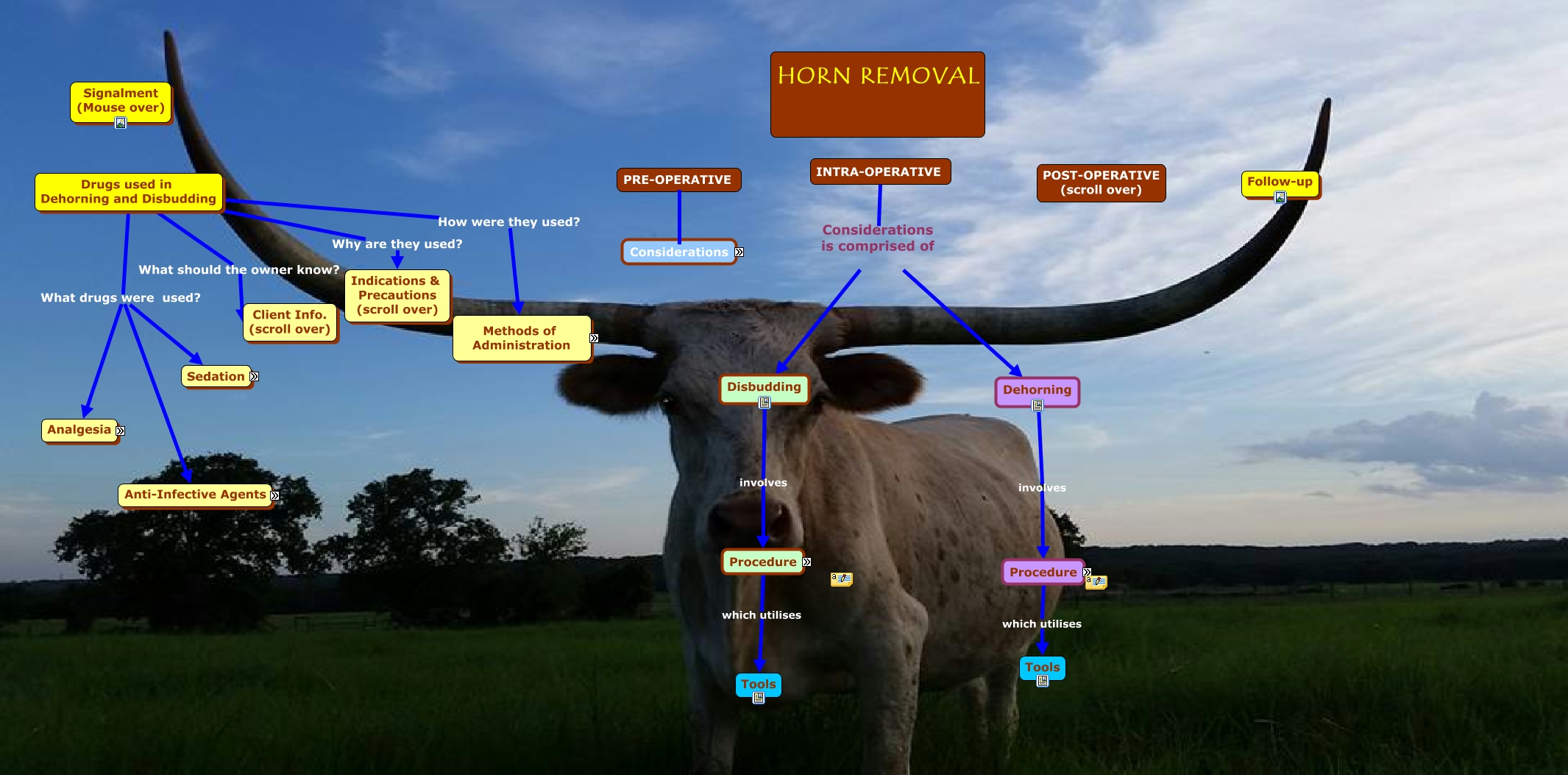 This Concept Map, created with IHMC CmapTools, has information related to: Lab 4 final, Drugs used in Dehorning and Disbudding How were they used? Methods of Administration, Drugs used in Dehorning and Disbudding What drugs were used? Anti-Infective Agents, Dehorning involves Procedure, PRE-OPERATIVE Risks to assess There are a number of risks to consider with respect to the handlers and animals involved. (Mouse over), Procedure which utilises Tools, PRE-OPERATIVE Welfare considerations Dehorning and disbudding are stressful procedures for cattle. As surgeons interested in both the welfare of the cattle and the attending veterinary staff we considered the welfare implications of this procedure., Drugs used in Dehorning and Disbudding Why are they used? Indications & Precautions (scroll over), Procedure What, PRE-OPERATIVE Assessment of fitness for surgery Both calves had an ASA Grade of 1 with no expected complications., INTRA-OPERATIVE Considerations is comprised of Disbudding, Procedure Why, Procedure How, Drugs used in Dehorning and Disbudding What drugs were used? Sedation, INTRA-OPERATIVE Considerations is comprised of Dehorning, Procedure What, Procedure which utilises Tools, Drugs used in Dehorning and Disbudding What drugs were used? Analgesia, Drugs used in Dehorning and Disbudding What should the owner know? Client Info. (scroll over), PRE-OPERATIVE Potential Complications Post dehorning or disbudding animals can, Disbudding involves Procedure