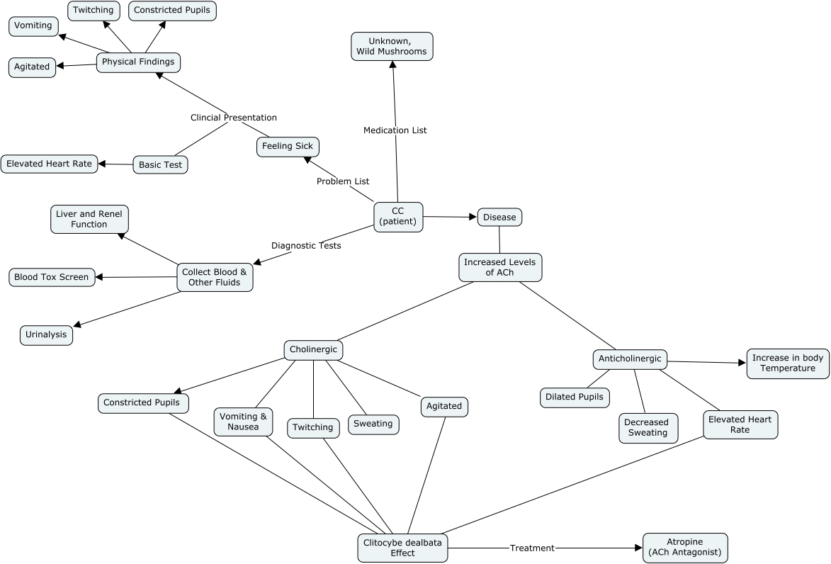 This Concept Map, created with IHMC CmapTools, has information related to: ACh Mushroom Case, Increased Levels of ACh ???? Cholinergic, Increased Levels of ACh ???? Anticholinergic, Cholinergic ???? Sweating, Physical Findings ???? Agitated, CC (patient) Problem List Feeling Sick, Twitching ???? Clitocybe dealbata Effect, Anticholinergic ???? Elevated Heart Rate, Physical Findings ???? Twitching, Clitocybe dealbata Effect Treatment Atropine (ACh Antagonist), CC (patient) ???? Disease, Cholinergic ???? Agitated, Cholinergic ???? Vomiting & Nausea, Cholinergic ???? Constricted Pupils, Anticholinergic ???? Increase in body Temperature, Elevated Heart Rate ???? Clitocybe dealbata Effect, Collect Blood & Other Fluids ???? Blood Tox Screen, CC (patient) Medication List Unknown, Wild Mushrooms, Collect Blood & Other Fluids ???? Urinalysis, Disease ???? Increased Levels of ACh, Feeling Sick Clincial Presentation Physical Findings