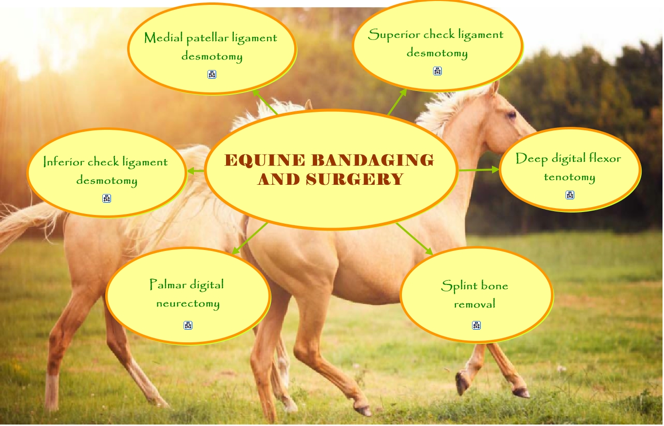 This Concept Map, created with IHMC CmapTools, has information related to: Lab 6- Equine bandaging and surgery, EQUINE BANDAGING AND SURGERY ???? Inferior check ligament desmotomy, EQUINE BANDAGING AND SURGERY ???? Superior check ligament desmotomy, EQUINE BANDAGING AND SURGERY ???? Splint bone removal, EQUINE BANDAGING AND SURGERY ???? Palmar digital neurectomy, EQUINE BANDAGING AND SURGERY ???? Medial patellar ligament desmotomy, EQUINE BANDAGING AND SURGERY ???? Deep digital flexor tenotomy