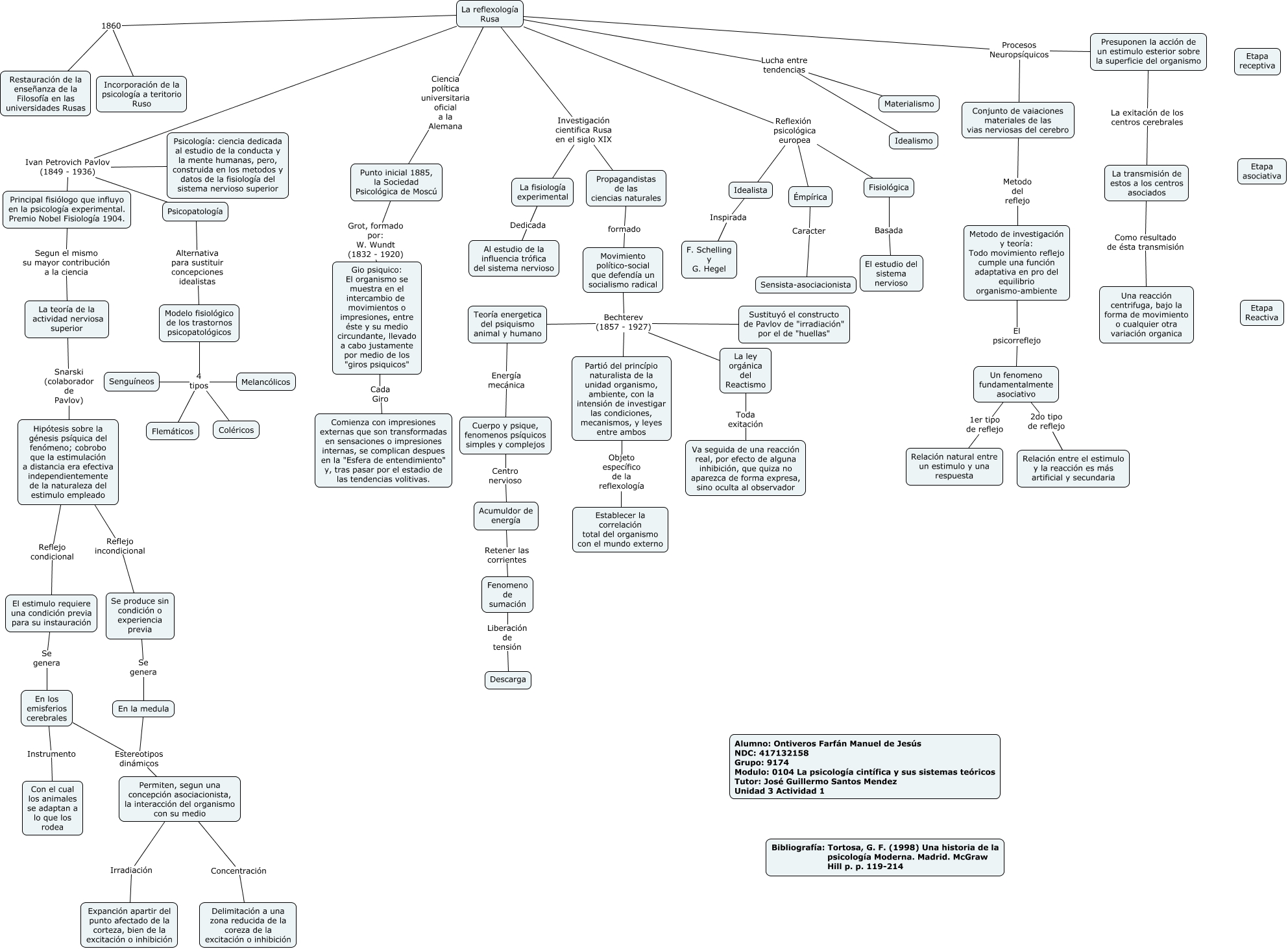 Este Cmap, tiene información relacionada con: Reflexología rusa, Conjunto de vaiaciones materiales de las vias nerviosas del cerebro Metodo del reflejo Metodo de investigación y teoría: Todo movimiento reflejo cumple una función adaptativa en pro del equilibrio organismo-ambiente, Movimiento político-social que defendía un socialismo radical Bechterev (1857 - 1927) Partió del princípio naturalista de la unidad organismo, ambiente, con la intensión de investigar las condiciones, mecanismos, y leyes entre ambos, En los emisferios cerebrales Estereotipos dinámicos Permiten, segun una concepción asociacionista, la interacción del organismo con su medio, Se produce sin condición o experiencia previa Se genera En la medula, Presuponen la acción de un estimulo esterior sobre la superficie del organismo La exitación de los centros cerebrales La transmisión de estos a los centros asociados, Idealista Inspirada F. Schelling y G. Hegel, La reflexología Rusa Procesos Neuropsíquicos Conjunto de vaiaciones materiales de las vias nerviosas del cerebro, Fisiológica Basada El estudio del sistema nervioso, La ley orgánica del Reactismo Toda exitación Va seguida de una reacción real, por efecto de alguna inhibición, que quiza no aparezca de forma expresa, sino oculta al observador, La reflexología Rusa Ivan Petrovich Pavlov (1849 - 1936) Principal fisiólogo que influyo en la psicología experimental. Premio Nobel Fisiología 1904., La reflexología Rusa Investigación cientifica Rusa en el siglo XIX Propagandistas de las ciencias naturales, Permiten, segun una concepción asociacionista, la interacción del organismo con su medio Concentración Delimitación a una zona reducida de la coreza de la excitación o inhibición, La reflexología Rusa Reflexión psicológica europea Émpírica, La reflexología Rusa Reflexión psicológica europea Idealista, La reflexología Rusa Investigación cientifica Rusa en el siglo XIX La fisiología experimental, La reflexología Rusa Lucha entre tendencias Idealismo, Propagandistas de las ciencias naturales formado Movimiento político-social que defendía un socialismo radical, La reflexología Rusa Reflexión psicológica europea Fisiológica, Fenomeno de sumación Liberación de tensión Descarga, La reflexología Rusa 1860 Restauración de la enseñanza de la Filosofía en las universidades Rusas