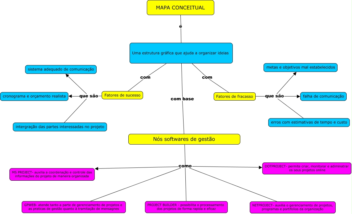 Esse mapa conceitual, produzido no IHMC CmapTools, tem a informação relacionada a: Rosy, Nós softwares de gestão como NETPROJECT- auxilia o gerenciamento de projetos, programas e portifolios da organização, Nós softwares de gestão como MS PROJECT- auxilia a coordenação e controle das informações do projeto de maneira organizada, Nós softwares de gestão como DOTPROJECT- permite criar, monitorar e adiminatrar os seus projetos online, Fatores de sucesso que são sistema adequado de comunicação, Fatores de sucesso que são intergração das partes interessadas no projeto, Uma estrutura gráfica que ajuda a organizar ideias com Fatores de fracasso, Fatores de fracasso que são erros com estimativas de tempo e custo, Fatores de fracasso que são metas e objetivos mal estabelecidos, Uma estrutura gráfica que ajuda a organizar ideias com base Nós softwares de gestão, MAPA CONCEITUAL é Uma estrutura gráfica que ajuda a organizar ideias, Nós softwares de gestão como GPWEB- atende tanto a parte de gerenciamento de projetos e as praticas de gestão quanto à tramitação de mensagnes, Fatores de fracasso que são falha de comunicação, Nós softwares de gestão como PROJECT BUILDER - possibilita o processamento dos projetos de forma rapida e eficaz, Fatores de sucesso que são cronograma e orçamento realista, Uma estrutura gráfica que ajuda a organizar ideias com Fatores de sucesso