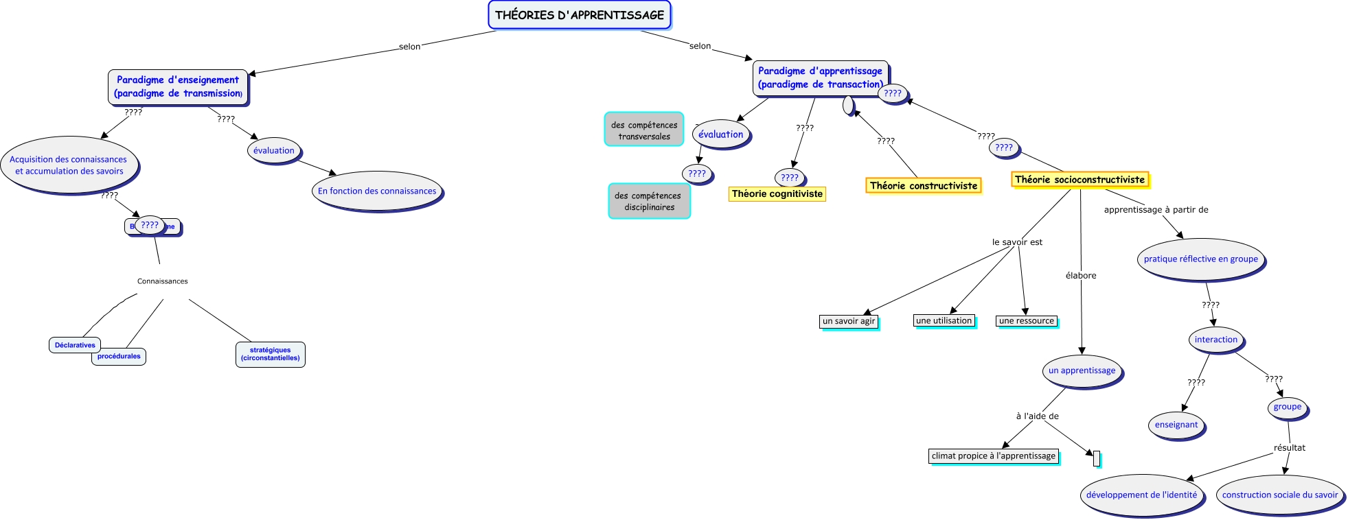 This Concept Map, created with IHMC CmapTools, has information related to: Untitled, THÉORIES D'APPRENTISSAGE selon Paradigme d'apprentissage (paradigme de transaction), Théorie constructiviste ????, groupe résultat développement de l'identité, groupe résultat construction sociale du savoir, Paradigme d'enseignement (paradigme de transmission) ???? Acquisition des connaissances et accumulation des savoirs, pratique réflective en groupe ???? interaction, Théorie socioconstructiviste le savoir est une utilisation, interaction ???? enseignant, Paradigme d'apprentissage (paradigme de transaction) ???? ????, Acquisition des connaissances et accumulation des savoirs ???? ????, un apprentissage à l'aide de climat propice à l'apprentissage, Théorie socioconstructiviste élabore un apprentissage, Théorie socioconstructiviste le savoir est une ressource, Théorie socioconstructiviste ???? ????, un apprentissage à l'aide de, interaction ???? groupe, Paradigme d'enseignement (paradigme de transmission) ???? évaluation, Paradigme d'apprentissage (paradigme de transaction) ???? évaluation, Théorie socioconstructiviste apprentissage à partir de pratique réflective en groupe, évaluation ???? ????