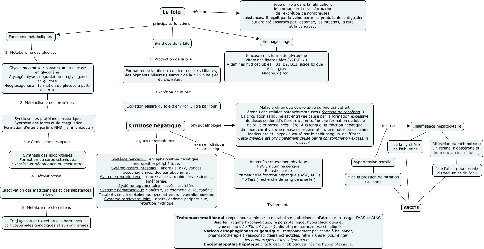 Cette carte de concepts créée avec IHMC CmapTools traite de: Cirrhose hépatique, Altération du métabolisme ( ↑ rénine, aldostérone et hormone antidiurétique ) ???? ↑ de l'absorption rénale du sodium et de l'eau, Cirrhose hépatique signes et symptômes Système nerveux : encéphalopathie hépatique, neuropathie périphérique. Sytème gastro-intestinal : anorexie, N/V, varices oesophagiennes, douleur abdominal. Système reproducteur : impuissance, atrophie des testicules, aménorhée. Système tégumentaire : pétéchies, ictère Système hématologique : anémie, splénomégalie, leucopénie Métabolisme : hypokaliémie, hyponatrémie, hyperalbuminémie Système cardiovasculaire : ascite, oedème périphérique, rétention hydrique, Synthèse de la bile 1. Production de la bile Formation de la bile qui contient des sels biliaires, des pigments biliaires ( surtout de la bilirubine ) et du cholestérol, Cirrhose hépatique physiopathologie Maladie chronique et évolutive du foie qui détruit l'étendu des cellules parenchymateuses ( fonction de sécrétion ) La circulation sanguine est entravée causé par la formation excessive de tissus conjonctifs fibreux qui entraîne une formation de lobule de taille et forme irrégulière. À la longue, la fonction hépatique diminue, car il y a une mauvaise regénération, une nutrition cellulaire inadéquate et l'hypoxie causé par le débit sanguin insuffisant. Cette maladie est principalement causé par la consommation excessive d'alcool., Le foie principales fonctions Synthèse de la bile, Anamnèse et examen physique FSC , albumine sérique Biopsie du foie Examen de la fonction hépatique ( AST, ALT ) Fit-Test ( recherche de sang dans selle ) Traitements Traitement traditionnel : repos pour diminuer le métabolisme, abstinence d'alcool, non-usage d'AAS et AINS Ascite : régime hypolipidiques, hyperprotéinique, hyperglucidiques et hyposodiques ( 3000 cal / jour ), diurétique, paracentèse si indiqué Varices oesophagiennes et gastrique : tamponnement par sonde à ballonnet, pharmacothérapie ( vasoconstricteurs octréotides, nitro ) Traiter pour éviter les hémorragies et les saignements. Encéphalopathie hépatique : lactulose, antibiotiques, régime hypoprotéinique., ↓ de la synthèse de l'albumine ???? ASCITE, Insuffisance hépatocytaire ???? ↓ de la synthèse de l'albumine, ↑ de la pression de filtration capillaire ???? ASCITE, Maladie chronique et évolutive du foie qui détruit l'étendu des cellules parenchymateuses ( fonction de sécrétion ) La circulation sanguine est entravée causé par la formation excessive de tissus conjonctifs fibreux qui entraîne une formation de lobule de taille et forme irrégulière. À la longue, la fonction hépatique diminue, car il y a une mauvaise regénération, une nutrition cellulaire inadéquate et l'hypoxie causé par le débit sanguin insuffisant. Cette maladie est principalement causé par la consommation excessive d'alcool. cirrhose Insuffisance hépatocytaire, Formation de la bile qui contient des sels biliaires, des pigments biliaires ( surtout de la bilirubine ) et du cholestérol 2. Excrétion de la bile Excrétion biliaire du foie d'environ 1 litre par jour., ↑ de la pression de filtration capillaire ???? hypertension portale, Le foie principales fonctions Fonctions métaboliques, ↑ de l'absorption rénale du sodium et de l'eau ???? ASCITE, Inactivation des médicaments et des substances nocives. 5. Métabolisme stéroïdiens Conjugaison et excrétion des hormones corticostéroïdes gonadiques et surrénaliennes, Fonctions métaboliques 1. Métabolisme des glucides Glycogénogenèse : conversion du glucose en glycogène. Glycogénolyse : dégradation du glycogène en glucose. Néoglucogenèse : formation de glucose à partir des A.A, Synthèse des protéines plasmatiques Synthèse des facteurs de coagulation Formation d'urée à partir d'NH3 ( ammoniaque ) 3. Métabolisme des lipides Synthèse des lipoprotéines Formation de corps cétoniques Synthèse et dégradation du cholestérol, Insuffisance hépatocytaire ???? Altération du métabolisme ( ↑ rénine, aldostérone et hormone antidiurétique ), Maladie chronique et évolutive du foie qui détruit l'étendu des cellules parenchymateuses ( fonction de sécrétion ) La circulation sanguine est entravée causé par la formation excessive de tissus conjonctifs fibreux qui entraîne une formation de lobule de taille et forme irrégulière. À la longue, la fonction hépatique diminue, car il y a une mauvaise regénération, une nutrition cellulaire inadéquate et l'hypoxie causé par le débit sanguin insuffisant. Cette maladie est principalement causé par la consommation excessive d'alcool. cirrhose hypertension portale, Emmagasinage ???? Glucose sous forme de glycogène Vitamines liposolubles ( A,D,E,K ) Vitamines hydrosolubles ( B1, B2, B12, acide folique ) Acide gras Minéraux ( fer )