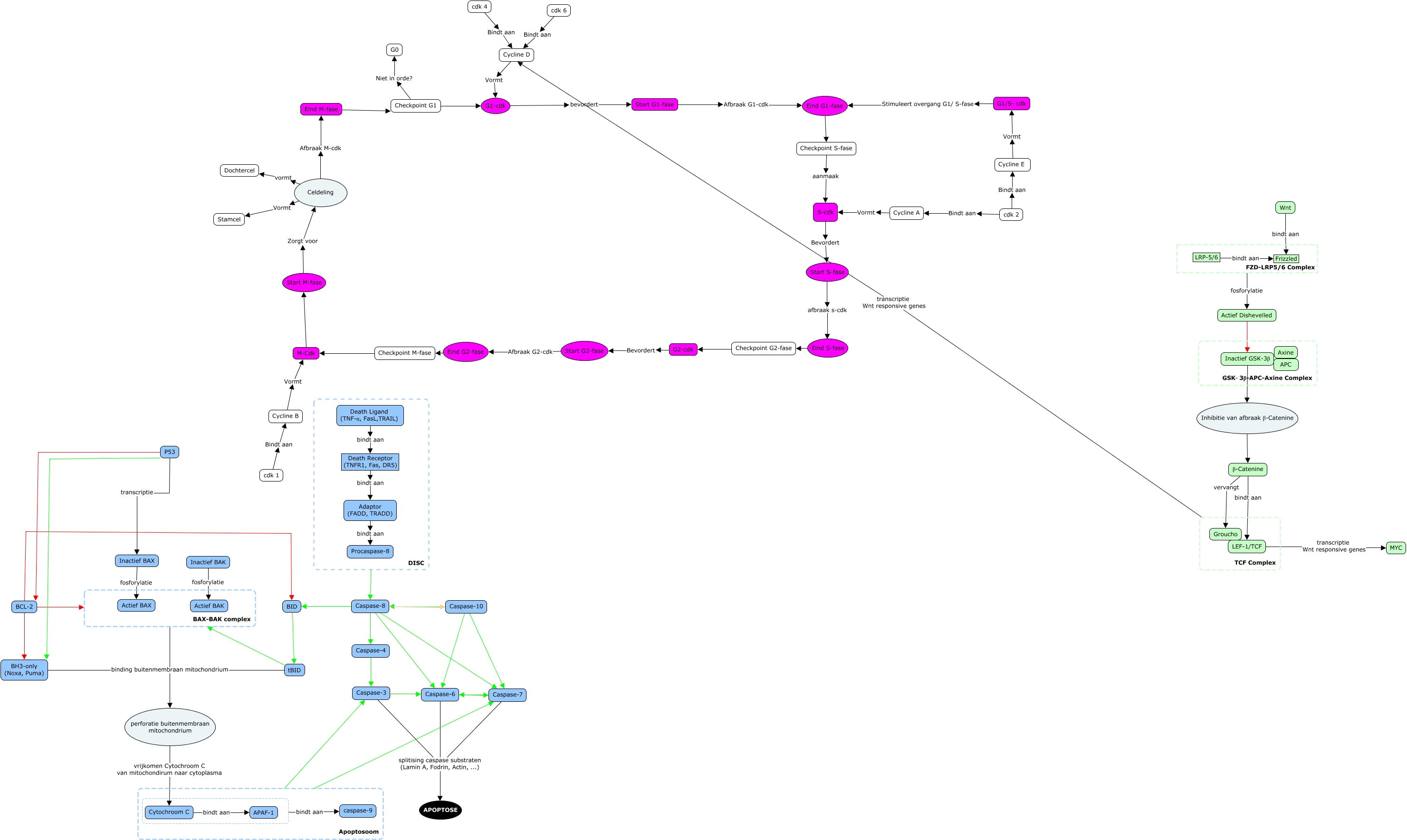 Deze Concept Map heeft informatie gerelateerd aan: Gezellig, Apoptosoom Caspase-7, BCL-2 BAX-BAK complex, Checkpoint M-fase M-Cdk, Caspase-7 Caspase-6, Start S-fase afbraak s-cdk Eind S-fase, Inactief BAX fosforylatie Actief BAX, TCF Complex transcriptie Wnt responsive genes Cycline D, Checkpoint G2-fase G2-cdk, Caspase-3 splitising caspase substraten (Lamin A, Fodrin, Actin, ...) APOPTOSE, tBID binding buitenmembraan mitochondrium perforatie buitenmembraan mitochondrium, Caspase-6 splitising caspase substraten (Lamin A, Fodrin, Actin, ...) APOPTOSE, cdk 1 Bindt aan Cycline B, DISC Caspase-8, S-cdk Bevordert Start S-fase, Actief Dishevelled Inactief GSK-3β, Caspase-8 Caspase-6, LEF-1/TCF transcriptie Wnt responsive genes MYC, G2-cdk Bevordert Start G2-fase, Caspase-3 Caspase-6, Caspase-6 Caspase-7