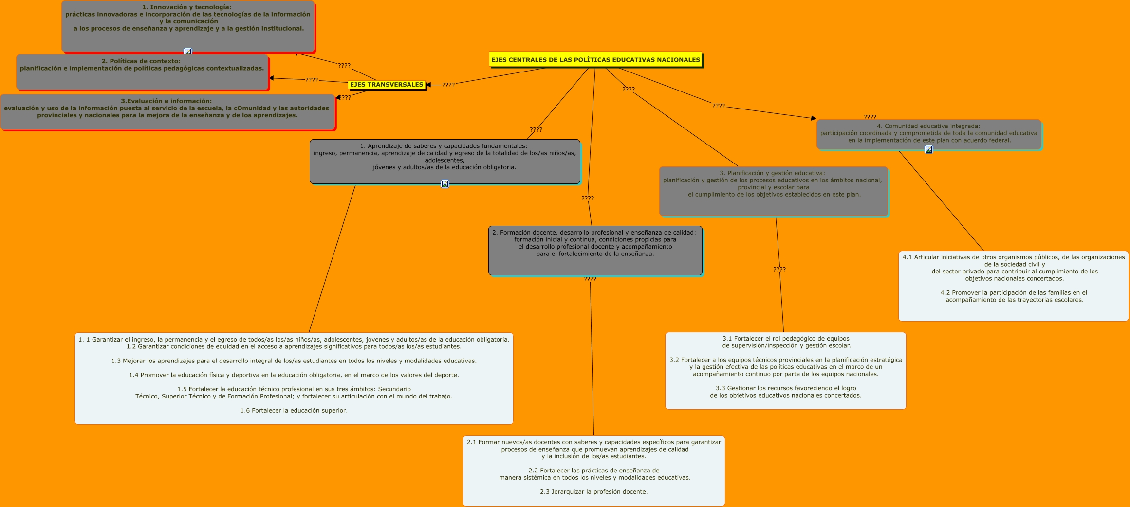 Este Cmap, tiene información relacionada con: PARCIAL 1 de Didáctica de la Historia, EJES CENTRALES DE LAS POLÍTICAS EDUCATIVAS NACIONALES ???? EJES TRANSVERSALES, EJES CENTRALES DE LAS POLÍTICAS EDUCATIVAS NACIONALES ???? 4. Comunidad educativa integrada: participación coordinada y comprometida de toda la comunidad educativa en la implementación de este plan con acuerdo federal., 3. Planificación y gestión educativa: planificación y gestión de los procesos educativos en los ámbitos nacional, provincial y escolar para el cumplimiento de los objetivos establecidos en este plan. ???? 3.1 Fortalecer el rol pedagógico de equipos de supervisión/inspección y gestión escolar. 3.2 Fortalecer a los equipos técnicos provinciales en la planificación estratégica y la gestión efectiva de las políticas educativas en el marco de un acompañamiento continuo por parte de los equipos nacionales. 3.3 Gestionar los recursos favoreciendo el logro de los objetivos educativos nacionales concertados., EJES CENTRALES DE LAS POLÍTICAS EDUCATIVAS NACIONALES ???? 3. Planificación y gestión educativa: planificación y gestión de los procesos educativos en los ámbitos nacional, provincial y escolar para el cumplimiento de los objetivos establecidos en este plan., EJES CENTRALES DE LAS POLÍTICAS EDUCATIVAS NACIONALES ???? ????, EJES TRANSVERSALES ???? 2. Políticas de contexto: planificación e implementación de políticas pedagógicas contextualizadas., EJES CENTRALES DE LAS POLÍTICAS EDUCATIVAS NACIONALES ???? 2. Formación docente, desarrollo profesional y enseñanza de calidad: formación inicial y continua, condiciones propicias para el desarrollo profesional docente y acompañamiento para el fortalecimiento de la enseñanza., 4. Comunidad educativa integrada: participación coordinada y comprometida de toda la comunidad educativa en la implementación de este plan con acuerdo federal. ???? 4.1 Articular iniciativas de otros organismos públicos, de las organizaciones de la sociedad civil y del sector privado para contribuir al cumplimiento de los objetivos nacionales concertados. 4.2 Promover la participación de las familias en el acompañamiento de las trayectorias escolares., EJES TRANSVERSALES ???? 1. Innovación y tecnología: prácticas innovadoras e incorporación de las tecnologías de la información y la comunicación a los procesos de enseñanza y aprendizaje y a la gestión institucional., 2. Formación docente, desarrollo profesional y enseñanza de calidad: formación inicial y continua, condiciones propicias para el desarrollo profesional docente y acompañamiento para el fortalecimiento de la enseñanza. ???? 2.1 Formar nuevos/as docentes con saberes y capacidades específicos para garantizar procesos de enseñanza que promuevan aprendizajes de calidad y la inclusión de los/as estudiantes. 2.2 Fortalecer las prácticas de enseñanza de manera sistémica en todos los niveles y modalidades educativas. 2.3 Jerarquizar la profesión docente., EJES TRANSVERSALES ???? 3.Evaluación e información: evaluación y uso de la información puesta al servicio de la escuela, la cOmunidad y las autoridades provinciales y nacionales para la mejora de la enseñanza y de los aprendizajes., 1. Aprendizaje de saberes y capacidades fundamentales: ingreso, permanencia, aprendizaje de calidad y egreso de la totalidad de los/as niños/as, adolescentes, jóvenes y adultos/as de la educación obligatoria. ???? 1. 1 Garantizar el ingreso, la permanencia y el egreso de todos/as los/as niños/as, adolescentes, jóvenes y adultos/as de la educación obligatoria. 1.2 Garantizar condiciones de equidad en el acceso a aprendizajes significativos para todos/as los/as estudiantes. 1.3 Mejorar los aprendizajes para el desarrollo integral de los/as estudiantes en todos los niveles y modalidades educativas. 1.4 Promover la educación física y deportiva en la educación obligatoria, en el marco de los valores del deporte. 1.5 Fortalecer la educación técnico profesional en sus tres ámbitos: Secundario Técnico, Superior Técnico y de Formación Profesional; y fortalecer su articulación con el mundo del trabajo. 1.6 Fortalecer la educación superior.