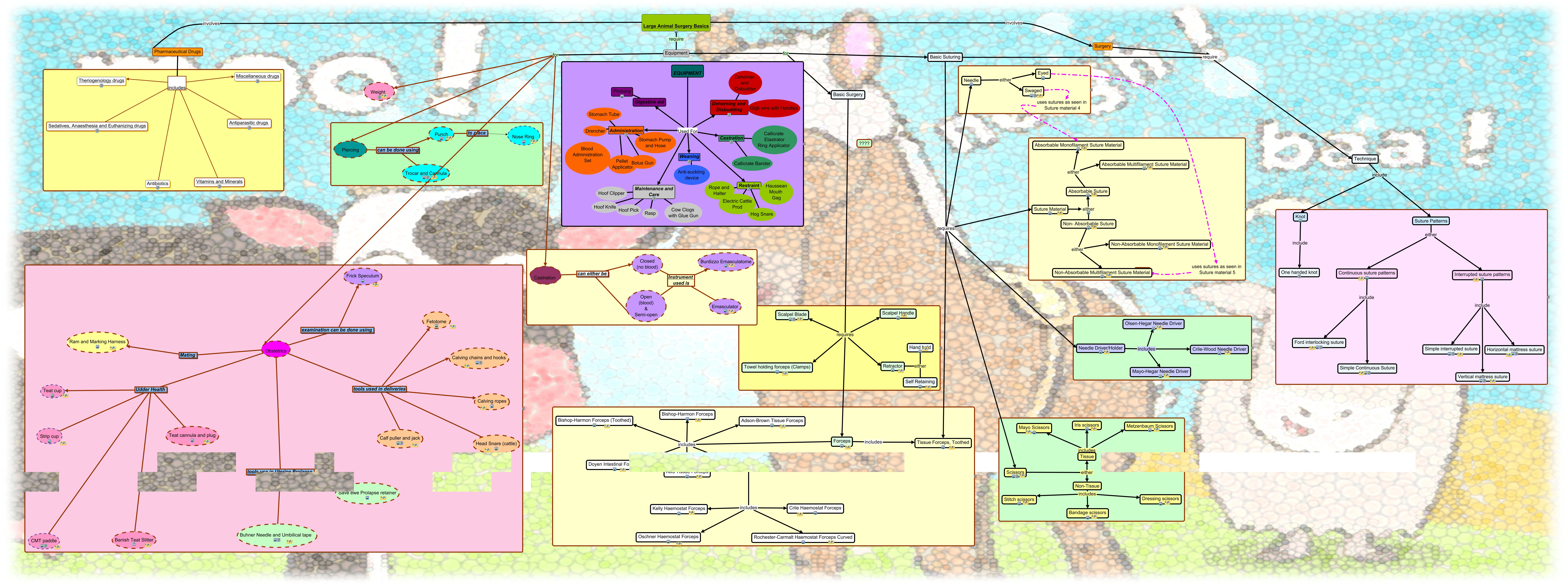 This Concept Map, created with IHMC CmapTools, has information related to: SVM 2018 Group 8 Lab 1- final to be graded 11.09.17, Forceps includes Bishop-Harmon Forceps (Toothed), Obstetrics Udder Health Teat cup, Basic Suturing requires Needle, Absorbable Suture either Absorbable Monofilament Suture Material, Maintenance and Care Hoof Pick, Non- Absorbable Suture either Non-Absorbable Multifilament Suture Material, Restraint Electric Cattle Prod, Restraint Haussean Mouth Gag, Haemostat Forceps includes Rochester-Carmalt Haemostat Forceps Curved, Basic Surgery requires Towel holding forceps (Clamps), Maintenance and Care Hoof Knife, Obstetrics tools use in Uterine Prolapse Buhner Needle and Umbilical tape, Closed (no blood) Instrument used is Emasculator, Pharmaceutical Drugs includes Sedatives, Anaesthesia and Euthanizing drugs, Large Animal Surgery Basics involves Surgery, Haemostat Forceps includes Oschner Haemostat Forceps, Pharmaceutical Drugs includes Antibiotics, Suture Patterns either Continuous suture patterns, Continuous suture patterns include Ford interlocking suture, Obstetrics tools used in deliveries Fetotome