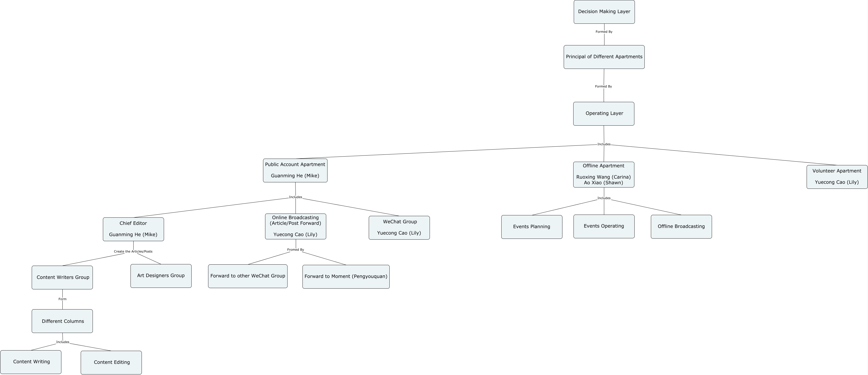 此概念图以 IHMC CmapTools 创建, 内含信息有关于: HiImGroup Structure, Operating Layer Includes Offline Apartment Ruoxing Wang (Carina) Ao Xiao (Shawn), Chief Editor Guanming He (Mike) Create the Articles/Posts Art Designers Group, Operating Layer Includes Volunteer Apartment Yuecong Cao (Lily), Content Writers Group Form Different Columns, Principal of Different Apartments Formed By Operating Layer, Decision Making Layer Formed By Principal of Different Apartments, Chief Editor Guanming He (Mike) Create the Articles/Posts Content Writers Group, Different Columns Includes Content Editing, Operating Layer Includes Public Account Apartment Guanming He (Mike), Online Broadcasting (Article/Post Forward) Yuecong Cao (Lily) Fromed By Forward to other WeChat Group, Public Account Apartment Guanming He (Mike) Includes WeChat Group Yuecong Cao (Lily), Public Account Apartment Guanming He (Mike) Includes Chief Editor Guanming He (Mike), Offline Apartment Ruoxing Wang (Carina) Ao Xiao (Shawn) Includes Events Operating, Offline Apartment Ruoxing Wang (Carina) Ao Xiao (Shawn) Includes Events Planning, Different Columns Includes Content Writing, Offline Apartment Ruoxing Wang (Carina) Ao Xiao (Shawn) Includes Offline Broadcasting, Public Account Apartment Guanming He (Mike) Includes Online Broadcasting (Article/Post Forward) Yuecong Cao (Lily), Online Broadcasting (Article/Post Forward) Yuecong Cao (Lily) Fromed By Forward to Moment (Pengyouquan)