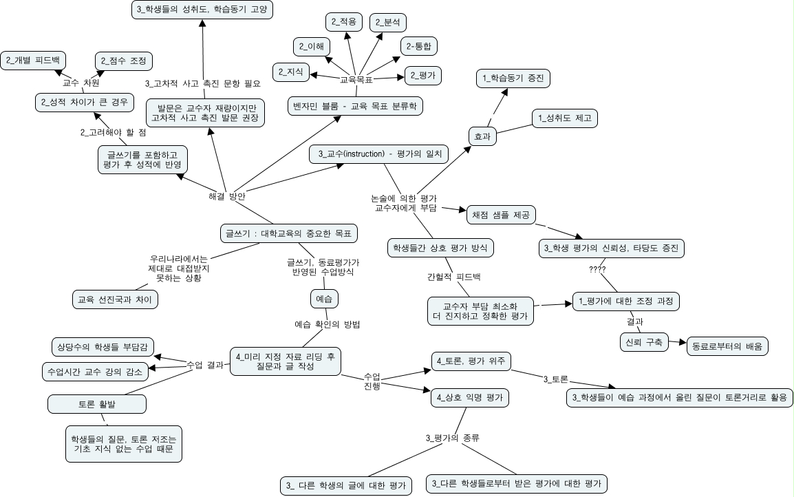 This Concept Map, created with IHMC CmapTools, has information related to: c_cmap_1109, 4_미리 지정 자료 리딩 후 질문과 글 작성 수업 결과 상당수의 학생들 부담감, 4_상호 익명 평가 3_평가의 종류 3_ 다른 학생의 글에 대한 평가, 4_토론, 평가 위주 3_토론 3_학생들이 예습 과정에서 올린 질문이 토론거리로 활용, 2_성적 차이가 큰 경우 교수 차원 2_개별 피드백, 학생들간 상호 평가 방식 간헐적 피드백 교수자 부담 최소화 더 진지하고 정확한 평가, 3_학생 평가의 신뢰성, 타당도 증진 ???? 1_평가에 대한 조정 과정, 예습 예습 확인의 방법 4_미리 지정 자료 리딩 후 질문과 글 작성, 벤자민 블룸 - 교육 목표 분류학 교육목표 2_적용, 신뢰 구축 ???? 동료로부터의 배움, 벤자민 블룸 - 교육 목표 분류학 교육목표 2-통합, 교수자 부담 최소화 더 진지하고 정확한 평가 1_평가에 대한 조정 과정, 2_성적 차이가 큰 경우 교수 차원 2_점수 조정, 4_상호 익명 평가 3_평가의 종류 3_다른 학생들로부터 받은 평가에 대한 평가, 글쓰기 : 대학교육의 중요한 목표 해결 방안 글쓰기를 포함하고 평가 후 성적에 반영, 벤자민 블룸 - 교육 목표 분류학 교육목표 2_분석, 글쓰기 : 대학교육의 중요한 목표 해결 방안 3_교수(instruction) - 평가의 일치, 3_교수(instruction) - 평가의 일치 논술에 의한 평가 교수자에게 부담 효과, 글쓰기를 포함하고 평가 후 성적에 반영 2_고려해야 할 점 2_성적 차이가 큰 경우, 벤자민 블룸 - 교육 목표 분류학 교육목표 2_평가, 4_미리 지정 자료 리딩 후 질문과 글 작성 수업 진행 4_상호 익명 평가