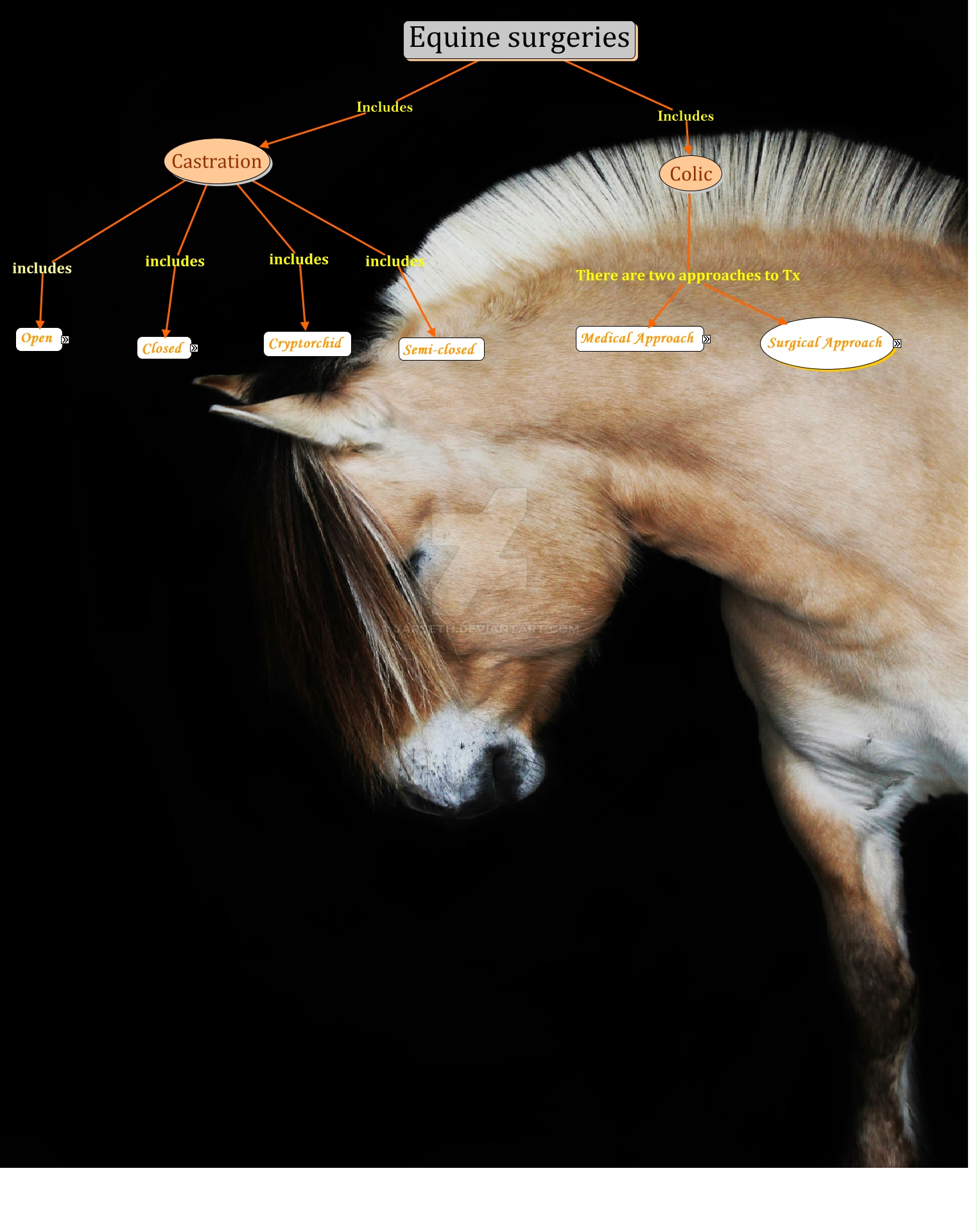 This Concept Map, created with IHMC CmapTools, has information related to: Untitled, Closed How (scroll over), Surgical Treatment of Colic Why it is done Causes of Colic, Colic There are two approaches to Tx Surgical Treatment of Colic, Open Advantages & Disadvantages, Equine surgeries Includes Castration, Closed Preoperative (scroll over), Open How, Castration includes Closed, Surgical Treatment of Colic How it is done Demonstration(s), Equine surgeries Includes Colic, Surgical Treatment of Colic What is considered afterward Post-Operative Care/ Client Information (scroll over), Medical Treatment of Colic (Please scroll over each concept) Includes Enteric Treatment, Closed Advantages & Disadvantages, Open What (scroll over), Closed What (scroll over), Open Postoperative (scroll over), Open Why (scroll over), Medical Treatment of Colic (Please scroll over each concept) Includes Analgesic Therapy, Open Relevant anatomy, Castration includes Cryptorchid