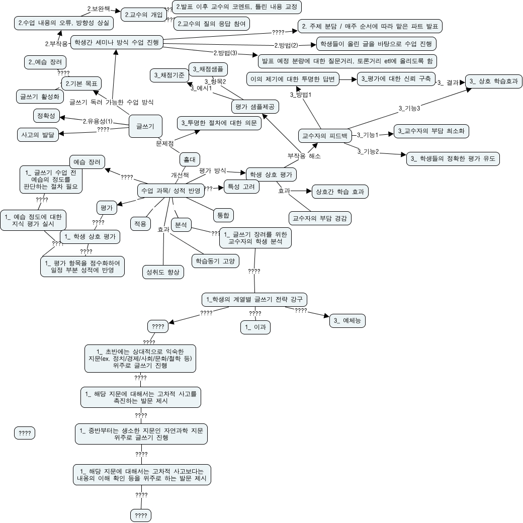 This Concept Map, created with IHMC CmapTools, has information related to: f_cmap_1113, 수업 과목/ 성적 반영 평가 방식 학생 상호 평가, 글쓰기 ???? 사고의 발달, 2.기본 목표 ???? 글쓰기 활성화, 평가 샘플제공 3_예시1 3_채점기준, 수업 과목/ 성적 반영 적용, 글쓰기 문제점 3_투명한 절차에 대한 의문, 1_ 해당 지문에 대해서는 고차적 사고를 촉진하는 발문 제시 ???? 1_ 중반부터는 생소한 지문인 자연과학 지문 위주로 글쓰기 진행, 학생간 세미나 방식 수업 진행 2.부작용 2.수업 내용의 오류, 방향성 상실, 2.기본 목표 ???? 2.,예습 장려, 수업 과목/ 성적 반영 효과 학습동기 고양, 1_ 학생 상호 평가 ???? 1_ 평가 항목을 점수화하여 일정 부분 성적에 반영, 글쓰기 2.유용성(1) 정확성, 교수자의 피드백 3_기능3 3_ 상호 학습효과, 평가 ???? 1_ 학생 상호 평가, 수업 과목/ 성적 반영 ???? 통합, 수업 과목/ 성적 반영 효과 성취도 향상, ???? ???? 1_ 초반에는 상대적으로 익숙한 지문(ex. 정치/경제/사회/문화/철학 등) 위주로 글쓰기 진행, 수업 과목/ 성적 반영 ???? 예습 장려, 홀대 개선책 수업 과목/ 성적 반영, 수업 과목/ 성적 반영 평가