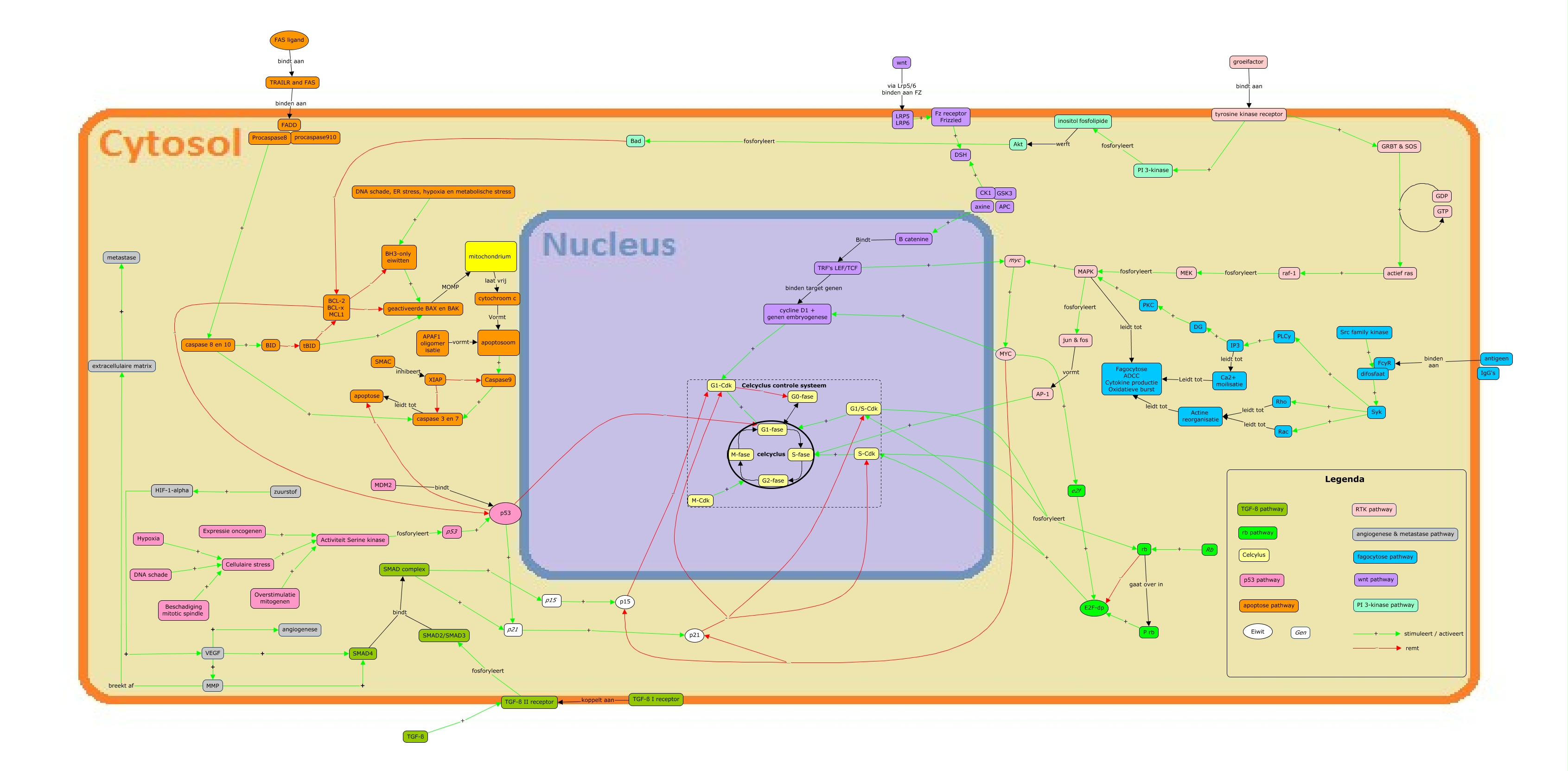 Deze Concept Map heeft informatie gerelateerd aan: cmap 21 22w, PI 3-kinase fosforyleert inositol fosfolipide, S-fase ???? G2-fase, Cellulaire stress + Activiteit Serine kinase, B catenine Bindt TRF's LEF/TCF, rb - E2F-dp, M-fase ???? G1-fase, M-Cdk + celcyclus, SMAC inhibeert XIAP, DNA schade + Cellulaire stress, BCL-2 BCL-x MCL1 - geactiveerde BAX en BAK, p53 - apoptose, Syk + Rac, SMAD2/SMAD3 bindt SMAD complex, Bad - BCL-2 BCL-x MCL1, DG + PKC, GRBT & SOS + actief ras, + stimuleert / activeert, TGF-ß I receptor koppelt aan TGF-ß II receptor, Rho leidt tot Actine reorganisatie, p15 - G1-Cdk