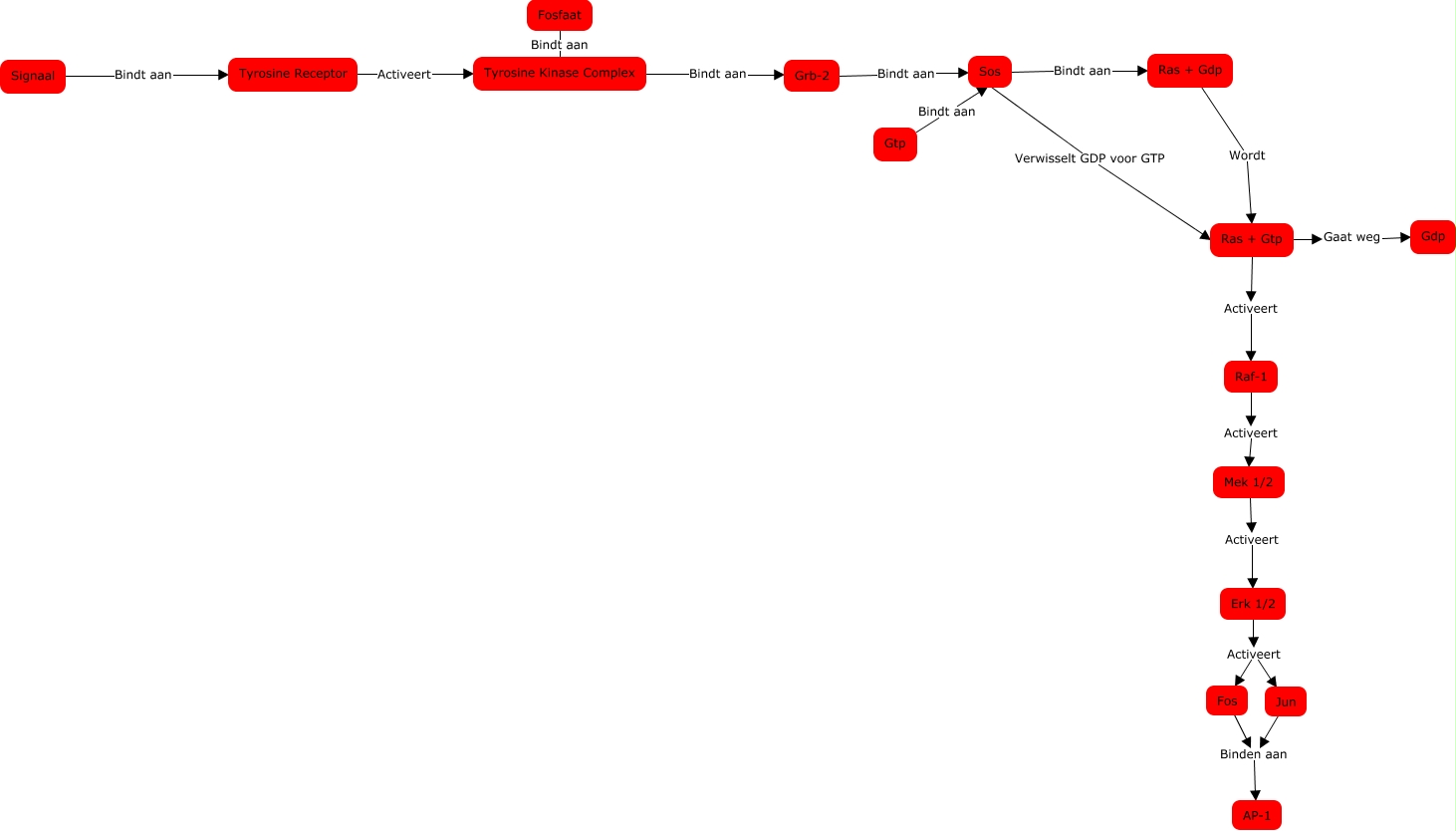 This Concept Map, created with IHMC CmapTools, has information related to: Tyrosine Kinase Complex, Tyrosine Receptor Activeert Tyrosine Kinase Complex, Sos Verwisselt GDP voor GTP Ras + Gtp, Fos Binden aan AP-1, Tyrosine Kinase Complex Bindt aan Grb-2, Fosfaat Bindt aan Tyrosine Kinase Complex, Signaal Bindt aan Tyrosine Receptor, Erk 1/2 Activeert Jun, Grb-2 Bindt aan Sos, Gtp Bindt aan Sos, Sos Bindt aan Ras + Gdp, Ras + Gtp Gaat weg Gdp, Ras + Gdp Wordt Ras + Gtp, Raf-1 Activeert Mek 1/2, Mek 1/2 Activeert Erk 1/2, Erk 1/2 Activeert Fos, Jun Binden aan AP-1, Ras + Gtp Activeert Raf-1
