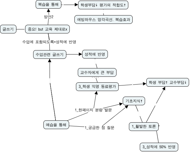 This Concept Map, created with IHMC CmapTools, has information related to: i_cmap_1115, 예습을 통해 1_한페이지 분량 발문 3_학생 익명 동료평가, 1_활발한 토론 ???? 3_성적에 50% 반영, 예습을 통해 수업관련 글쓰기, 성적에 반영 교수자에게 큰 부담, 기초지식↑ 1_활발한 토론, 학생부담↓ 평가의 적합도↑ 에빙하우스 망각곡선. 복습효과, 중요! but 교육 제대로x 방안2 복습을 통해, 중요! but 교육 제대로x 수업에 포함되도록+성적에 반영 수업관련 글쓰기, 3_학생 익명 동료평가 학생 부담↑ 교수부담↓, 교수자에게 큰 부담 ???? 3_학생 익명 동료평가, 예습을 통해 1_궁금한 점 질문 기초지식↑, 중요! but 교육 제대로x 수업에 포함되도록+성적에 반영 수업관련 글쓰기, 수업관련 글쓰기 예습을 통해, 예습을 통해 1_한페이지 분량 발문 기초지식↑, 복습을 통해 학생부담↓ 평가의 적합도↑, 수업관련 글쓰기 ???? 성적에 반영, 1_활발한 토론 학생 부담↑ 교수부담↓, 글쓰기 ???? 중요! but 교육 제대로x