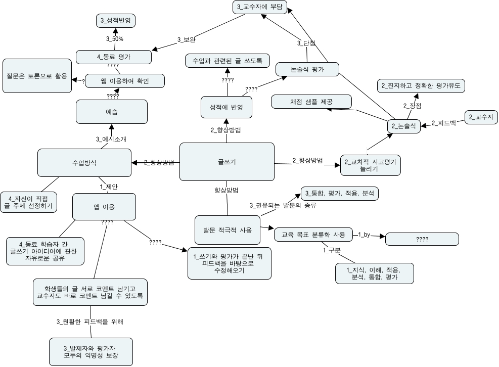 This Concept Map, created with IHMC CmapTools, has information related to: j_cmap_1115, 앱 이용 ???? 1_쓰기와 평가가 끝난 뒤 피드백을 바탕으로 수정해오기, 수업방식 ???? 4_자신이 직접 글 주제 선정하기, 앱 이용 ???? 4_동료 학습자 간 글쓰기 아이디어에 관한 자유로운 공유, 교육 목표 분류학 사용 1_by ????, 4_동료 평가 3_50% 3_성적반영, 2_교수자 2_피드백 2_논술식, 2_논술식 ???? 3_교수자에 부담, 수업방식 1_제안 앱 이용, 성적에 반영 ???? 수업과 관련된 글 쓰도록, 글쓰기 2_향상방법 성적에 반영, 글쓰기 ???? 수업방식, 글쓰기 2_향상방법 수업방식, 글쓰기 향상방법 발문 적극적 사용, 성적에 반영 ???? 논술식 평가, 웹 이용햐여 확인 ???? 질문은 토론으로 활용, 예습 ???? 웹 이용햐여 확인, 3_교수자에 부담 3_보완 4_동료 평가, 발문 적극적 사용 3_권유되는 발문의 종류 3_통합, 평가, 적용, 분석, 학생들의 글 서로 코멘트 남기고 교수자도 바로 코멘트 남길 수 있도록 3_원활한 피드백을 위해 3_발제자와 평가자 모두의 익명성 보장, 웹 이용햐여 확인 ???? 4_동료 평가
