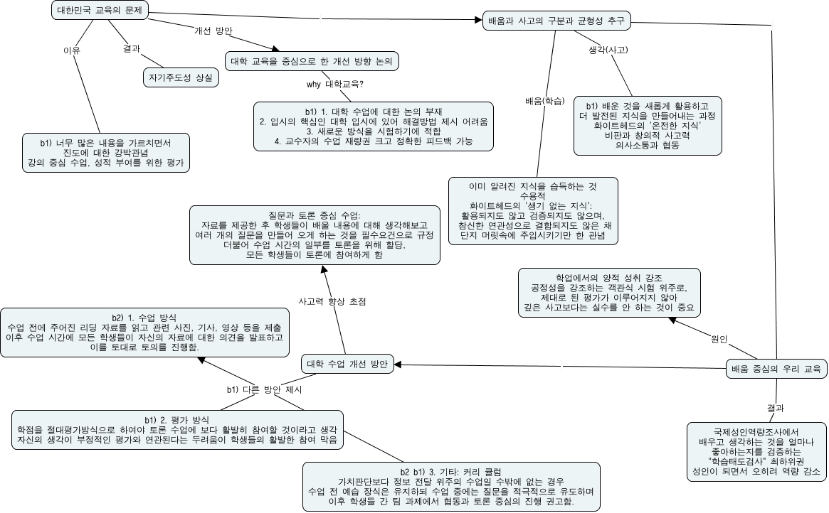 This Concept Map, created with IHMC CmapTools, has information related to: b_cmap_1116_one noshow, 대한민국 교육의 문제 이유 b1) 너무 많은 내용을 가르치면서 진도에 대한 강박관념 강의 중심 수업, 성적 부여를 위한 평가, 배움과 사고의 구분과 균형성 추구 배움 중심의 우리 교육, 대한민국 교육의 문제 결과 자기주도성 상실, 배움 중심의 우리 교육 원인 학업에서의 양적 성취 강조 공정성을 강조하는 객관식 시험 위주로, 제대로 된 평가가 이루어지지 않아 깊은 사고보다는 실수를 안 하는 것이 중요, 대학 수업 개선 방안 b1) 다른 방안 제시 b1) 2. 평가 방식 학점을 절대평가방식으로 하여야 토론 수업에 보다 활발히 참여할 것이라고 생각 자신의 생각이 부정적인 평가와 연관된다는 두려움이 학생들의 활발한 참여 막음, 대학 수업 개선 방안 b1) 다른 방안 제시 b2 b1) 3. 기타: 커리 큘럼 가치판단보다 정보 전달 위주의 수업일 수밖에 없는 경우 수업 전 예습 장식은 유지하되 수업 중에는 질문을 적극적으로 유도하며 이후 학생들 간 팀 과제에서 협동과 토론 중심의 진행 권고함., 대학 수업 개선 방안 사고력 향상 초점 질문과 토론 중심 수업: 자료를 제공한 후 학생들이 배울 내용에 대해 생각해보고 여러 개의 질문을 만들어 오게 하는 것을 필수요건으로 규정 더불어 수업 시간의 일부를 토론을 위해 할당, 모든 학생들이 토론에 참여하게 함, 배움 중심의 우리 교육 대학 수업 개선 방안, 대학 수업 개선 방안 b1) 다른 방안 제시 b2) 1. 수업 방식 수업 전에 주어진 리딩 자료를 읽고 관련 사진, 기사, 영상 등을 제출 이후 수업 시간에 모든 학생들이 자신의 자료에 대한 의견을 발표하고 이를 토대로 토의를 진행함., 배움과 사고의 구분과 균형성 추구 배움(학습) 이미 알려진 지식을 습득하는 것 수용적 화이트헤드의 '생기 없는 지식': 활용되지도 않고 검증되지도 않으며, 참신한 연관성으로 결합되지도 않은 채 단지 머릿속에 주입시키기만 한 관념, 대한민국 교육의 문제 개선 방안 대학 교육을 중심으로 한 개선 방향 논의, 대학 교육을 중심으로 한 개선 방향 논의 why 대학교육? b1) 1. 대학 수업에 대한 논의 부재 2. 입시의 핵심인 대학 입시에 있어 해결방법 제시 어려움 3. 새로운 방식을 시험하기에 적합 4. 교수자의 수업 재량권 크고 정확한 피드백 가능, 대한민국 교육의 문제 배움과 사고의 구분과 균형성 추구, 배움 중심의 우리 교육 결과 국제성인역량조사에서 배우고 생각하는 것을 얼마나 좋아하는지를 검증하는 "학습태도검사" 최하위권 성인이 되면서 오히려 역량 감소, 배움과 사고의 구분과 균형성 추구 생각(사고) b1) 배운 것을 새롭게 활용하고 더 발전된 지식을 만들어내는 과정 화이트헤드의 '온전한 지식' 비판과 창의적 사고력 의사소통과 협동