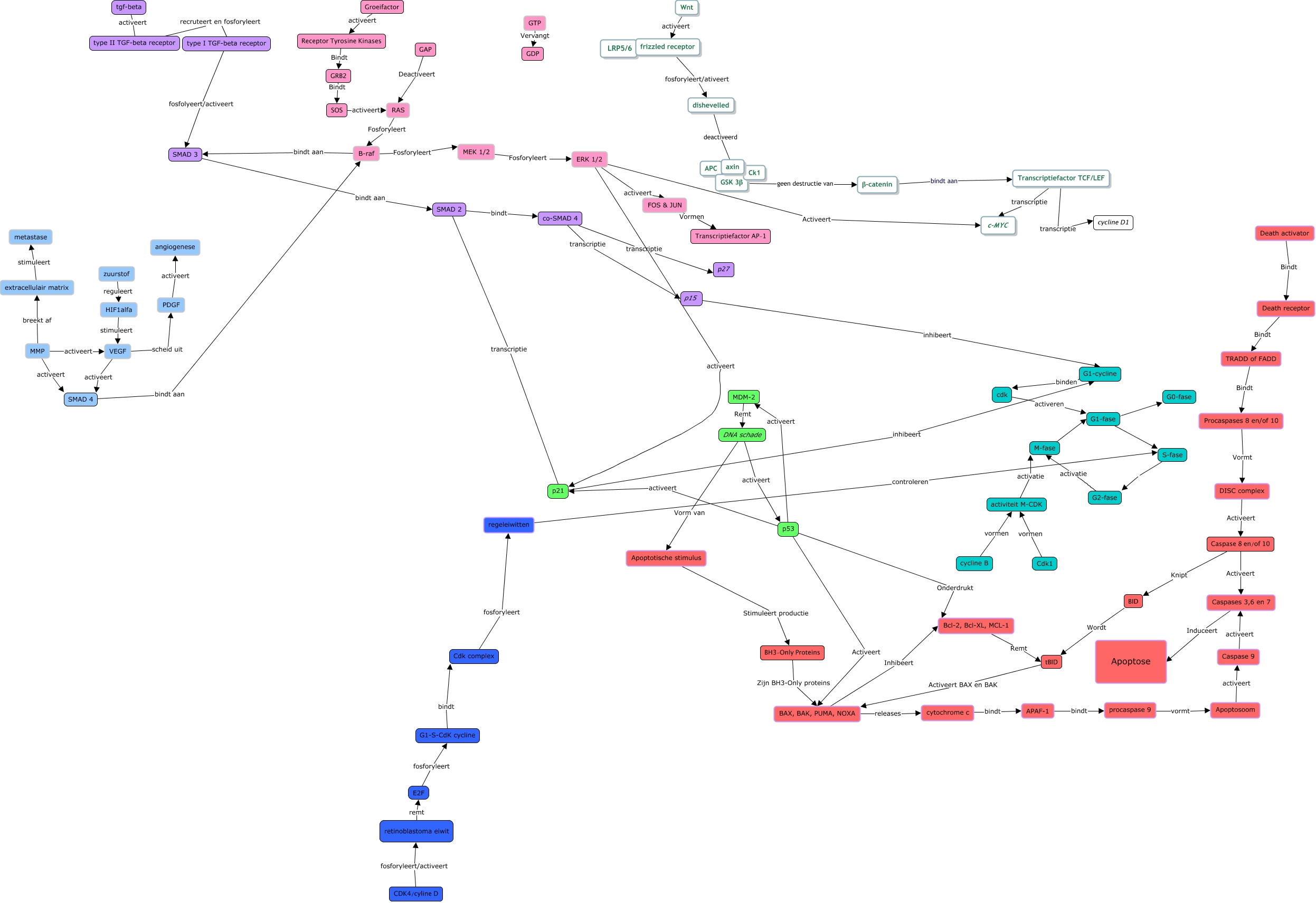 Deze Concept Map heeft informatie gerelateerd aan: Zonder titel, MDM-2 Remt DNA schade, GRB2 Bindt SOS, Bcl-2, Bcl-XL, MCL-1 Remt tBID, FOS & JUN Vormen Transcriptiefactor AP-1, SOS activeert RAS, procaspase 9 vormt Apoptosoom, p53 Activeert BAX, BAK, PUMA, NOXA, cytochrome c bindt APAF-1, Death activator Bindt Death receptor, p53 activeert MDM-2, G2-fase activatie M-fase, Transcriptiefactor TCF/LEF transcriptie c-MYC, tBID Activeert BAX en BAK BAX, BAK, PUMA, NOXA, SMAD 4 bindt aan B-raf, p53 activeert p21, B-raf bindt aan SMAD 3, B-raf Fosforyleert MEK 1/2, activiteit M-CDK activatie M-fase, GTP Vervangt GDP, zuurstof reguleert HIF1alfa