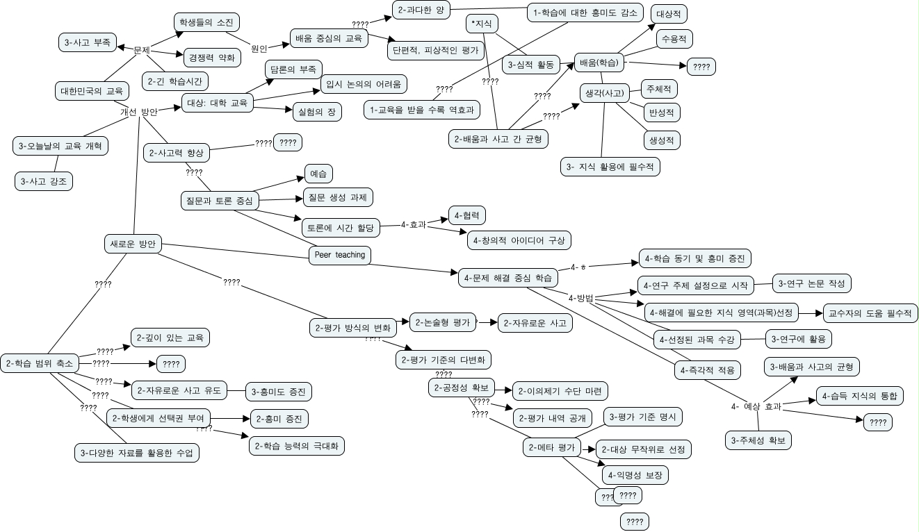 This Concept Map, created with IHMC CmapTools, has information related to: d_cmap_1117, 배움(학습) ????, 대상: 대학 교육 ???? 담론의 부족, 2-평가 방식의 변화 ???? 2-평가 기준의 다변화, 2-메타 평가 ???? 2-대상 무작위로 선정, 생각(사고) ???? 생성적, 배움(학습) ???? 대상적, 배움 중심의 교육 ???? 단편적, 피상적인 평가, 2-학습 범위 축소 ???? 3-다양한 자료를 활용한 수업, 2-학습 범위 축소 ???? ????, 2-메타 평가 ???? ????, 질문과 토론 중심 구체적 질문 생성 과제, 2-평가 기준의 다변화 ???? 2-공정성 확보, *지식 ???? 2-배움과 사고 간 균형, 4-문제 해결 중심 학습 4- 예상 효과 3-배움과 사고의 균형, 대한민국의 교육 개선 방안 2-사고력 향상, 4-선정된 과목 수강 ???? 3-연구에 활용, 4-문제 해결 중심 학습 4-방법 4-연구 주제 설정으로 시작, 질문과 토론 중심 구체적 토론에 시간 할당, 배움 중심의 교육 ???? 2-과다한 양, 대한민국의 교육 문제 3-사고 부족
