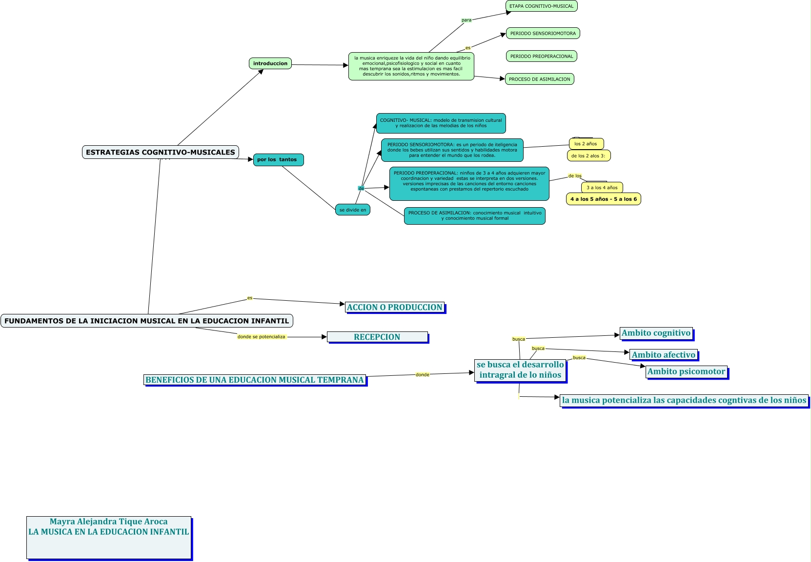 Este Cmap, tiene información relacionada con: la musica en la educacion infantil, FUNDAMENTOS DE LA INICIACION MUSICAL EN LA EDUCACION INFANTIL donde se potencializa RECEPCION, la musica enriqueze la vida del niño dando equilibrio emocional,psicofisiologico y social en cuanto mas temprana sea la estimulacion es mas facil descubrir los sonidos,ritmos y movimientos. es PERIODO SENSORIOMOTORA, se busca el desarrollo intragral de lo niños busca Ambito afectivo, se divide en de COGNITIVO- MUSICAL: modelo de transmision cultural y realizacion de las melodias de los niños, introduccion ???? la musica enriqueze la vida del niño dando equilibrio emocional,psicofisiologico y social en cuanto mas temprana sea la estimulacion es mas facil descubrir los sonidos,ritmos y movimientos., ???? PERIODO SENSORIOMOTORA: es un periodo de iteligencia donde los bebes utilizan sus sentidos y habilidades motora para entender el mundo que los rodea., ESTRATEGIAS COGNITIVO-MUSICALES ???? FUNDAMENTOS DE LA INICIACION MUSICAL EN LA EDUCACION INFANTIL, se divide en de PERIODO SENSORIOMOTORA: es un periodo de iteligencia donde los bebes utilizan sus sentidos y habilidades motora para entender el mundo que los rodea., se divide en de PERIODO PREOPERACIONAL: ninños de 3 a 4 años adquieren mayor coordinacion y variedad estas se interpreta en dos versiones. versiones imprecisas de las canciones del entorno canciones espontaneas con prestamos del repertorio escuchado, ESTRATEGIAS COGNITIVO-MUSICALES ???? por los tantos, FUNDAMENTOS DE LA INICIACION MUSICAL EN LA EDUCACION INFANTIL es ACCION O PRODUCCION, la musica enriqueze la vida del niño dando equilibrio emocional,psicofisiologico y social en cuanto mas temprana sea la estimulacion es mas facil descubrir los sonidos,ritmos y movimientos. ???? PROCESO DE ASIMILACION, la musica enriqueze la vida del niño dando equilibrio emocional,psicofisiologico y social en cuanto mas temprana sea la estimulacion es mas facil descubrir los sonidos,ritmos y movimientos. para ETAPA COGNITIVO-MUSICAL, se divide en de PROCESO DE ASIMILACION: conocimiento musical intuitivo y conocimiento musical formal, se busca el desarrollo intragral de lo niños la musica potencializa las capacidades cogntivas de los niños, ???? los 2 años, ESTRATEGIAS COGNITIVO-MUSICALES ???? introduccion, se busca el desarrollo intragral de lo niños busca Ambito cognitivo, BENEFICIOS DE UNA EDUCACION MUSICAL TEMPRANA donde se busca el desarrollo intragral de lo niños, se busca el desarrollo intragral de lo niños busca Ambito psicomotor