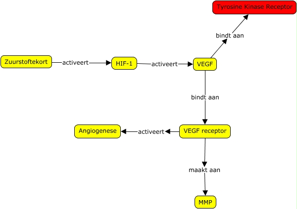 Deze Concept Map heeft informatie gerelateerd aan: Angiogenese, VEGF receptor activeert Angiogenese, VEGF bindt aan VEGF receptor, HIF-1 activeert VEGF, VEGF bindt aan Tyrosine Kinase Receptor, Zuurstoftekort activeert HIF-1, VEGF receptor maakt aan MMP