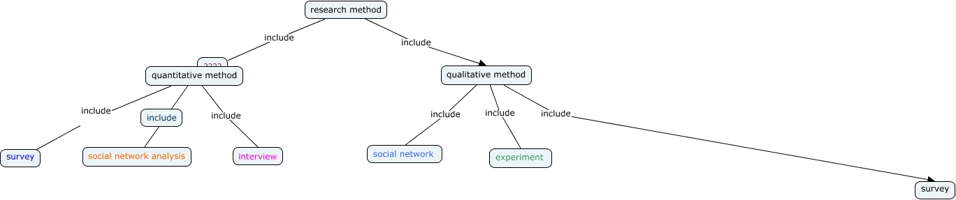 This Concept Map, created with IHMC CmapTools, has information related to: Komronshoh, qualitative method include survey, qualitative method include experiment, research method include qualitative method, qualitative method include social network, quantitative method include interview, research method include ????, quantitative method social network analysis, quantitative method include survey