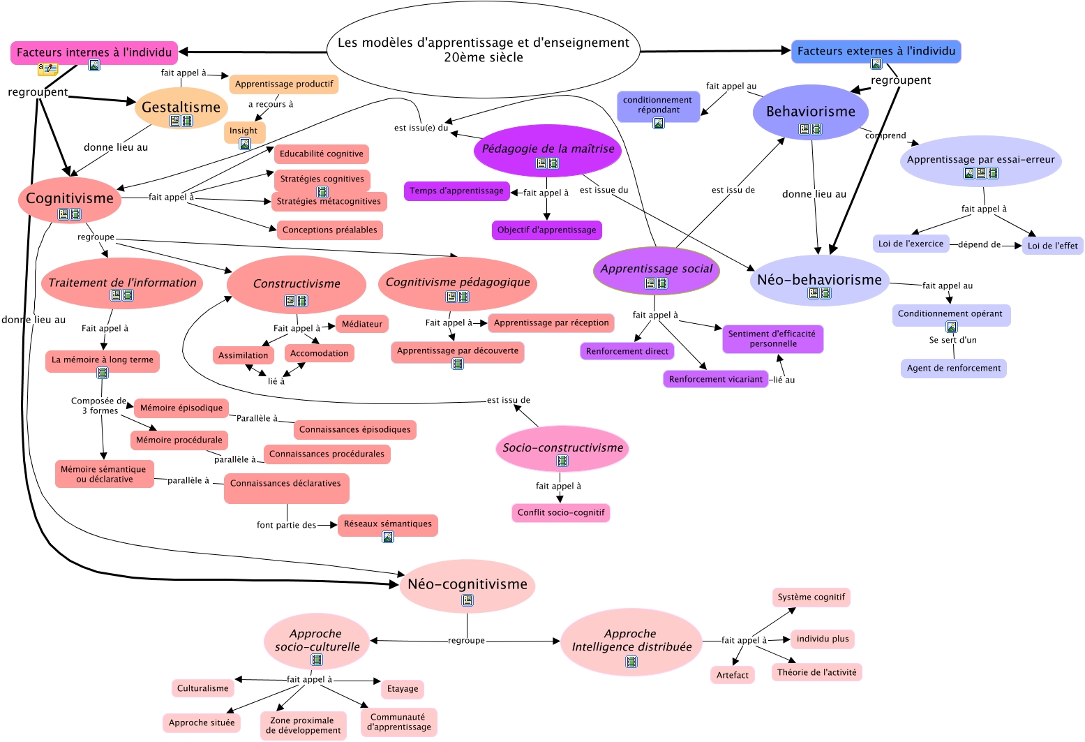 Cette carte de concepts créée avec IHMC CmapTools traite de: Les modèles d'apprentissage du 20ème siècle, Facteurs externes à l'individu regroupent Behaviorisme, Behaviorisme fait appel au conditionnement répondant, Conditionnement opérant Se sert d'un Agent de renforcement, Cognitivisme fait appel à Conceptions préalables, Cognitivisme regroupe Cognitivisme pédagogique, Socio-constructivisme fait appel à Conflit socio-cognitif, Apprentissage social fait appel à Renforcement vicariant, Accomodation lié à Assimilation, Loi de l'exercice dépend de Loi de l'effet, Néo-behaviorisme fait appel au Conditionnement opérant, Approche socio-culturelle fait appel à Communauté d'apprentissage, Mémoire sémantique ou déclarative parallèle à Connaissances déclaratives, Les modèles d'apprentissage et d'enseignement 20ème siècle Basés sur Facteurs internes à l'individu, Approche Intelligence distribuée fait appel à individu plus, Cognitivisme donne lieu au Néo-cognitivisme, Apprentissage productif a recours à Insight, Constructivisme Fait appel à Assimilation, Apprentissage social est issu(e) du Cognitivisme, Approche Intelligence distribuée fait appel à Théorie de l'activité, Mémoire épisodique Parallèle à Connaissances épisodiques