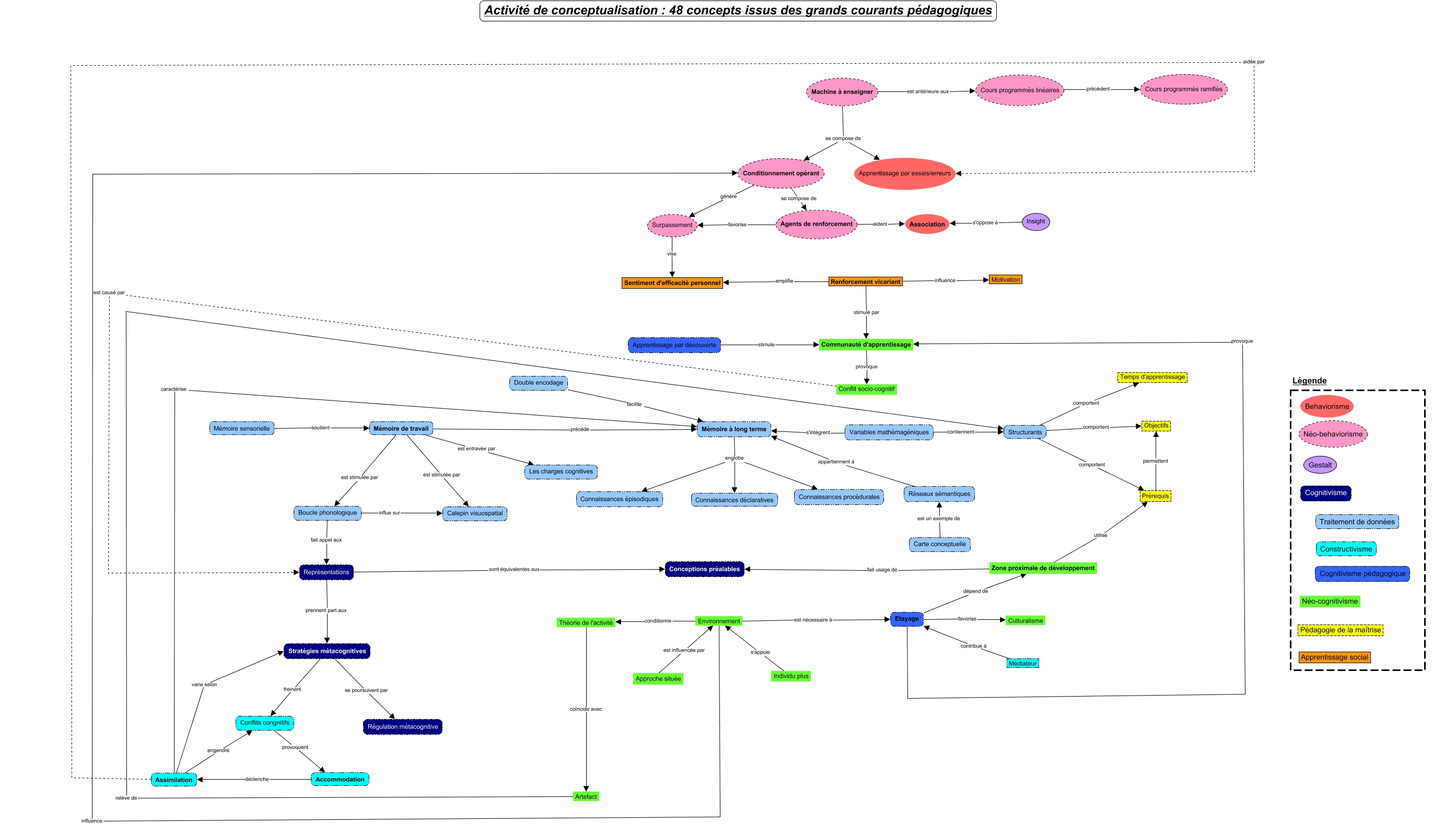Cette carte de concepts créée avec IHMC CmapTools traite de: Carte collaborative, Artefact relève de Structurants, Conflits congnitifs provoquent Accommodation, Médiateur contribue à Etayage, Conditionnement opérant génère Surpassement, Théorie de l'activité coïncide avec Artefact, Renforcement vicariant influence Motivation, Conditionnement opérant se compose de Agents de renforcement, Stratégies métacognitives freinent Conflits congnitifs, Mémoire de travail est stimulée par Calepin visuospatial, Structurants comportent Prérequis, Variables mathémagéniques contiennent Structurants, Individu plus s'appuie Environnement, Environnement influence Conditionnement opérant, Mémoire de travail précède Mémoire à long terme, Machine à enseigner se compose de Apprentissage par essais/erreurs, Cours programmés linéaires précèdent Cours programmés ramifiés, Zone proximale de développement fait usage de Conceptions préalables, Prérequis permettent Objectifs, Machine à enseigner se compose de Conditionnement opérant, Mémoire à long terme englobe Connaissances procédurales