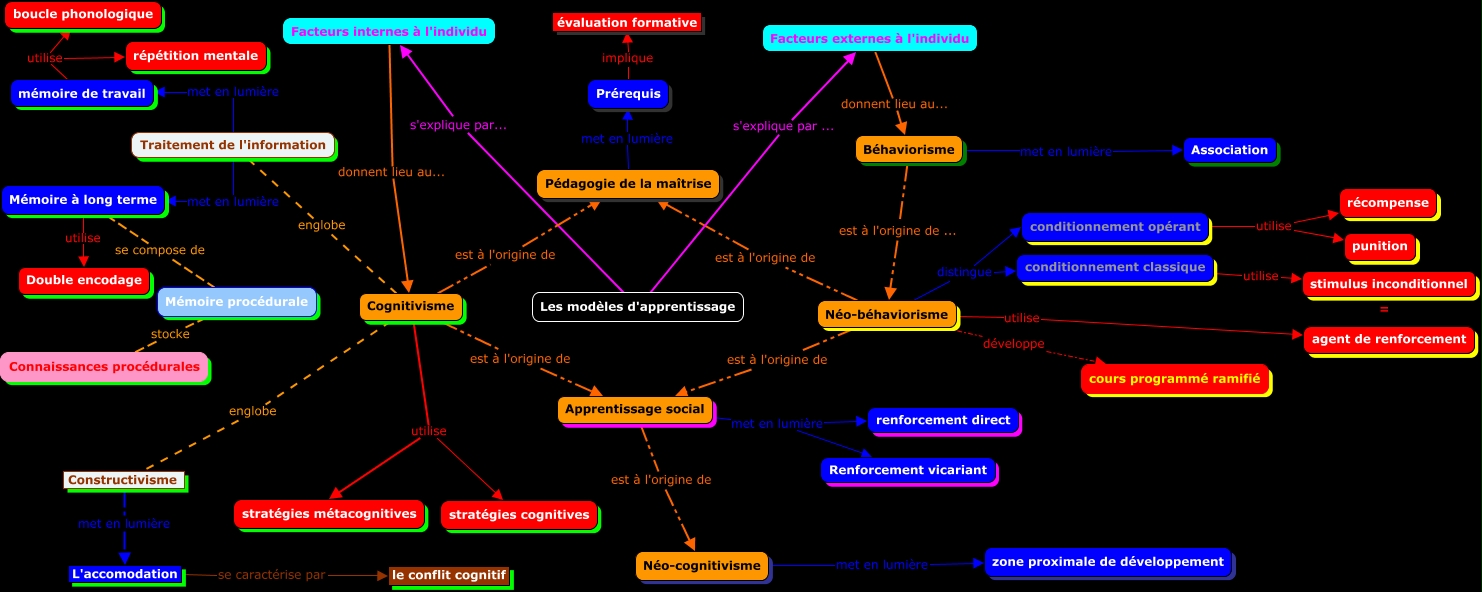 Cette carte de concepts créée avec IHMC CmapTools traite de: Sciences de l'éducation TP1 liste 4 modèle apprentissage 2.cmap, Mémoire à long terme utilise Double encodage, Apprentissage social est à l'origine de Néo-cognitivisme, Néo-béhaviorisme est à l'origine de Pédagogie de la maîtrise, Néo-béhaviorisme distingue conditionnement opérant, Apprentissage social met en lumière Renforcement vicariant, Béhaviorisme met en lumière Association, Les modèles d'apprentissage s'explique par... Facteurs internes à l'individu, Néo-béhaviorisme est à l'origine de Apprentissage social, Cognitivisme utilise stratégies cognitives, Facteurs internes à l'individu donnent lieu au... Cognitivisme, Cognitivisme englobe Traitement de l'information, Néo-béhaviorisme distingue conditionnement classique, Prérequis implique évaluation formative, Mémoire à long terme se compose de Mémoire procédurale, conditionnement opérant utilise punition, conditionnement classique utilise stimulus inconditionnel, Mémoire procédurale stocke Connaissances procédurales, conditionnement opérant utilise récompense, L'accomodation se caractérise par le conflit cognitif, Cognitivisme est à l'origine de Pédagogie de la maîtrise