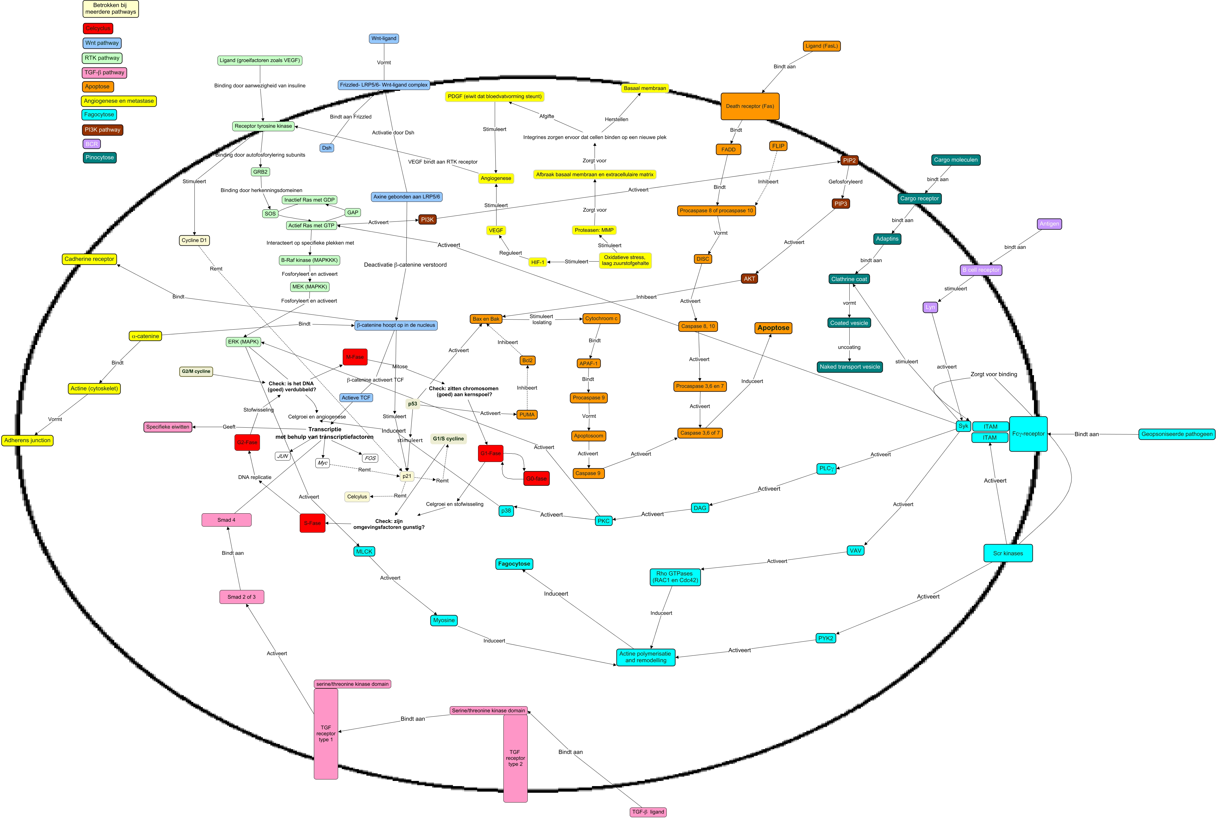 Deze Concept Map heeft informatie gerelateerd aan: CMAP, Receptor tyrosine kinase Binding door autofosforylering subunits GRB2, Myc Remt p21, Check: is het DNA (goed) verdubbeld? M-Fase, Myosine Induceert Actine polymerisatie and remodelling, Procaspase 9 Vormt Apoptosoom, Cargo moleculen bindt aan Cargo receptor, Adaptins bindt aan Clathrine coat, Clathrine coat vormt Coated vesicle, DAG Activeert PKC, β-catenine hoopt op in de nucleus β-catenine activeert TCF Actieve TCF, Transcriptie Geeft Specifieke eiwitten, Angiogenese VEGF bindt aan RTK receptor Receptor tyrosine kinase, TGF-β ligand Bindt aan Serine/threonine kinase domain, Wnt-ligand Vormt Frizzled- LRP5/6- Wnt-ligand complex, Ligand (groeifactoren zoals VEGF) Binding door aanwezigheid van insuline Receptor tyrosine kinase, PYK2 Activeert Actine polymerisatie and remodelling, Procaspase 3,6 en 7 Activeert Caspase 3,6 of 7, Axine gebonden aan LRP5/6 Deactivatie β-catenine verstoord β-catenine hoopt op in de nucleus, Bcl2 Inhibeert Bax en Bak, Caspase 8, 10 Activeert Procaspase 3,6 en 7