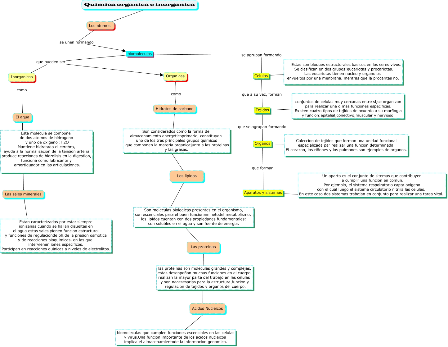 Este Cmap, tiene información relacionada con: organigrama, Los atomos se unen formando biomoleculas, biomoleculas se agrupan formando Celulas, Tejidos que se agrupan formando Organos, Hidratos de carbono ???? Los lipidos, Las proteinas ???? Acidos Nucleicos, Organos ???? Coleccion de tejidos que forman una unidad funcional especializada par realizar una funcion determinada, El corazon, los riñones y los pulmones son ejemplos de organos., Celulas que a su vez, forman Tejidos, Inorganicas como Las sales minerales, El agua como Las sales minerales, Aparatos y sistemas ???? Un aparto es el conjunto de sitemas que contribuyen a cumplir una funcion en comun. Por ejemplo, el sistema respoiratorio capta oxigeno con el cual luego el sistema circulatorio nitrira las celulas. En este caso dos sistemas trabajan en conjunto para realizar una tarea vital., Quimica organica e inorganica ???? Los atomos, El agua ???? Esta molecula se compone de dos atomos de hidrogeno y uno de oxigeno :H2O Mantiene hidratado el cerebro, ayuda a la normalizacion de la tension arterial produce reacciones de hidrolisis en la digestion, funciona como lubricante y amortiguador en las articulaciones., Los lipidos ???? Las proteinas, biomoleculas que pueden ser Organicas, Organos que forman Aparatos y sistemas, Tejidos ???? conjuntos de celulas muy cercanas entre si,se organizan para realizar una o mas funciones especificas. Existen cuatro tipos de tejidos de acuerdo a su morflogia y funcion:epitelial,conectivo,muscular y nervioso., biomoleculas que pueden ser Inorganicas, Acidos Nucleicos ???? biomoleculas que cumplen funciones escenciales en las celulas y virus.Una funcion importante de los acidos nucleicos implica el almacenamientode la informacion genomica., Organicas como Hidratos de carbono, Las sales minerales ???? Estan caracterizadas por estar siempre ionizanas cuando se hallan disueltas en el agua estas sales yienen funcion estructural y funciones de regulacionde ph,de la presion osmotica y de reacciones bioquimicas, en las que intervienen iones especificos. Participan en reacciones quinicas a niveles de electrolitos.
