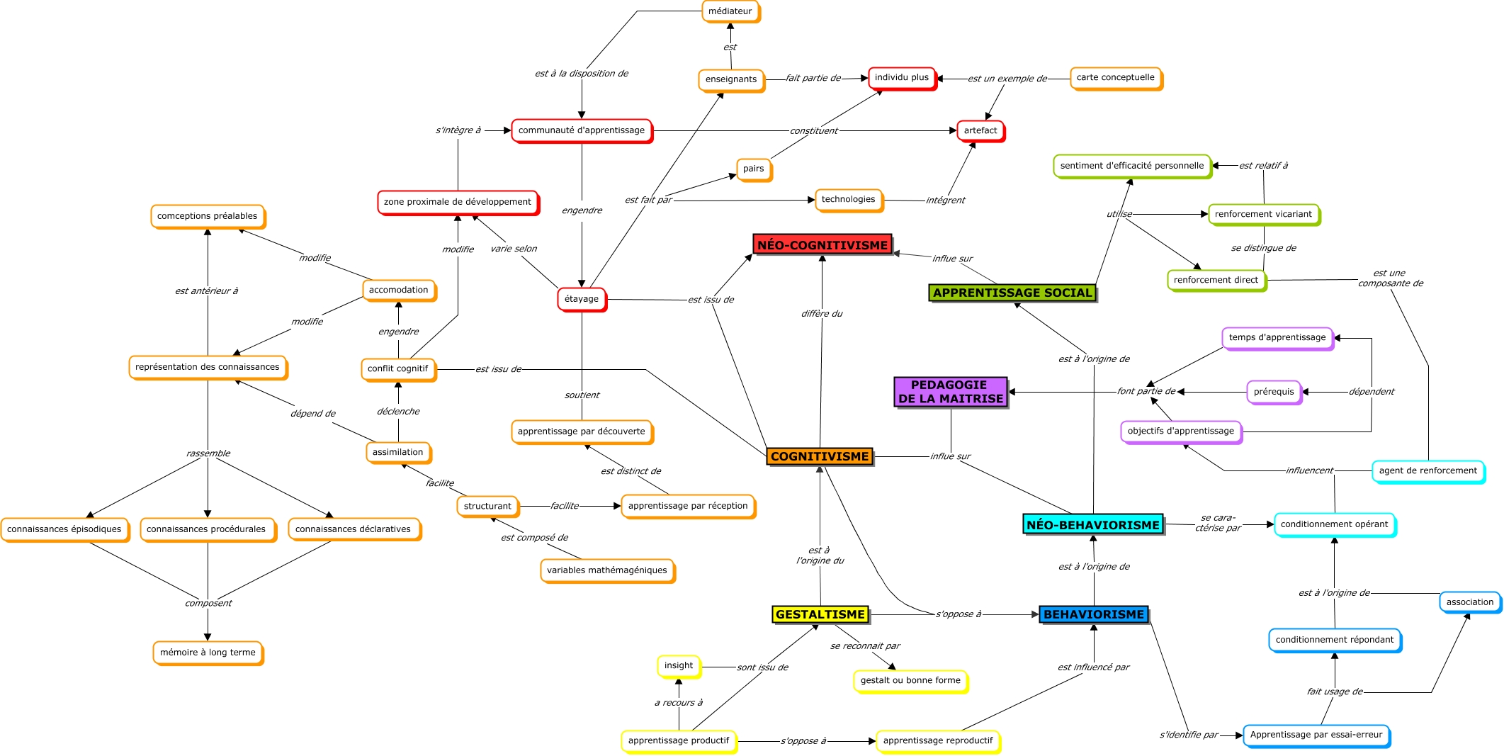 Dieses mit IHMC CmapTools erstellte CMap hat Informationen bezüglich: carte collaborative structurée G13, pairs constituent individu plus, GESTALTISME s'oppose à BEHAVIORISME, étayage est issu de NÉO-COGNITIVISME, agent de renforcement influencent objectifs d'apprentissage, temps d'apprentissage font partie de PEDAGOGIE DE LA MAITRISE, connaissances épisodiques composent connaissances déclaratives, BEHAVIORISME est à l'origine de NÉO-BEHAVIORISME, étayage soutient apprentissage par découverte, conditionnement opérant influencent objectifs d'apprentissage, enseignants fait partie de individu plus, apprentissage productif a recours à insight, apprentissage productif sont issu de GESTALTISME, carte conceptuelle est un exemple de artefact, conflit cognitif modifie zone proximale de développement, Apprentissage par essai-erreur fait usage de association, NÉO-BEHAVIORISME influe sur PEDAGOGIE DE LA MAITRISE, GESTALTISME se reconnait par gestalt ou bonne forme, structurant facilite assimilation, objectifs d'apprentissage dépendent prérequis, connaissances épisodiques composent mémoire à long terme