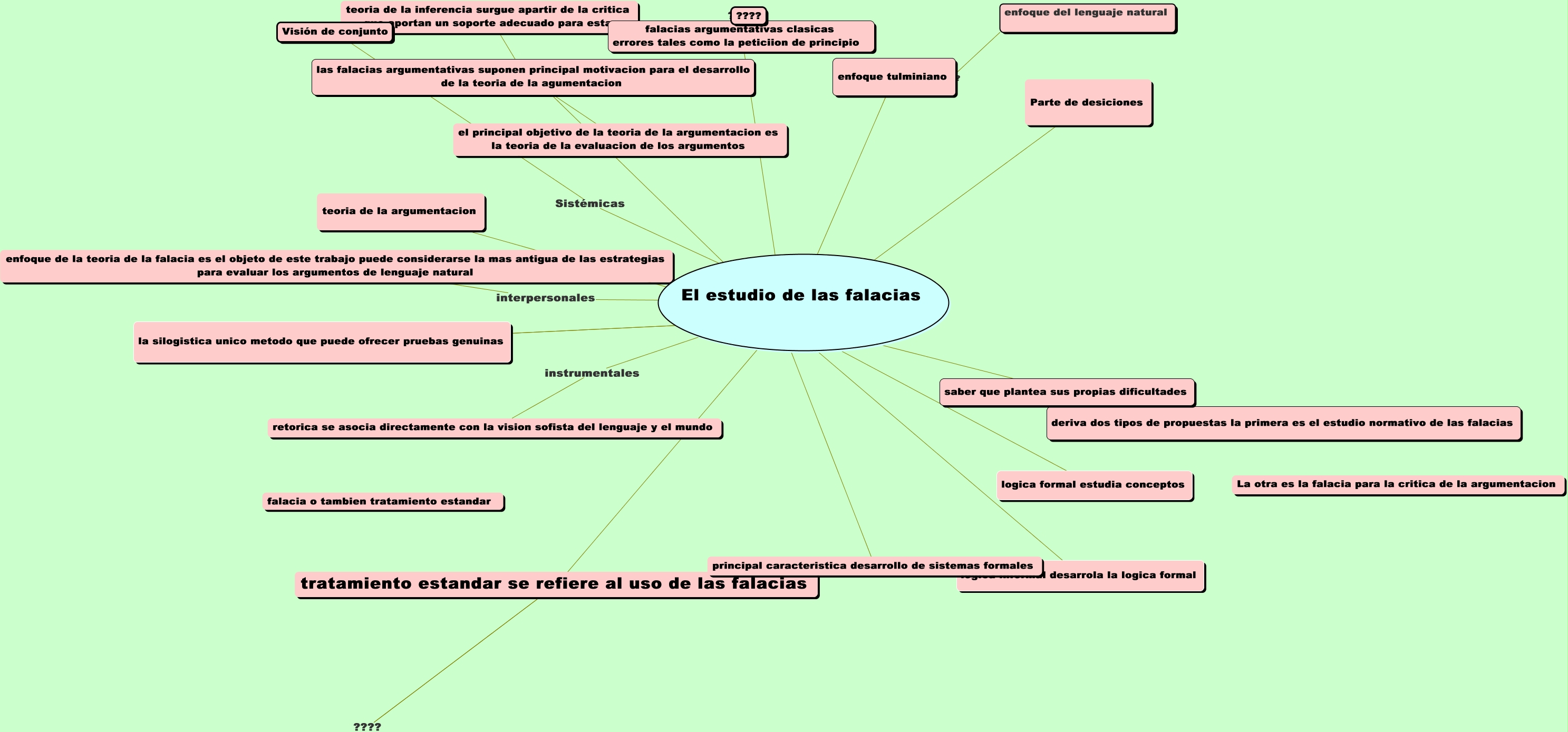 Este Cmap, tiene información relacionada con: El estudio de las falacias, El estudio de las falacias ???? saber que plantea sus propias dificultades, falacias argumentativas clasicas errores tales como la peticiion de principio ???? ????, El estudio de las falacias interpersonales enfoque de la teoria de la falacia es el objeto de este trabajo puede considerarse la mas antigua de las estrategias para evaluar los argumentos de lenguaje natural, El estudio de las falacias ???? teoria de la argumentacion, El estudio de las falacias ???? falacias argumentativas clasicas errores tales como la peticiion de principio, El estudio de las falacias ???? logica formal estudia conceptos, las falacias argumentativas suponen principal motivacion para el desarrollo de la teoria de la agumentacion ???? el principal objetivo de la teoria de la argumentacion es la teoria de la evaluacion de los argumentos, El estudio de las falacias ???? logica informal desarrola la logica formal, El estudio de las falacias ???? las falacias argumentativas suponen principal motivacion para el desarrollo de la teoria de la agumentacion, El estudio de las falacias ???? la silogistica unico metodo que puede ofrecer pruebas genuinas, El estudio de las falacias ???? tratamiento estandar se refiere al uso de las falacias, El estudio de las falacias ???? enfoque tulminiano, saber que plantea sus propias dificultades ???? deriva dos tipos de propuestas la primera es el estudio normativo de las falacias, El estudio de las falacias ???? la silogistica unico metodo que puede ofrecer pruebas genuinas, las falacias argumentativas suponen principal motivacion para el desarrollo de la teoria de la agumentacion ???? teoria de la inferencia surgue apartir de la critica que aportan un soporte adecuado para esta, enfoque tulminiano ???? enfoque del lenguaje natural, El estudio de las falacias ???? principal caracteristica desarrollo de sistemas formales, El estudio de las falacias ???? Parte de desiciones, El estudio de las falacias Sistémicas Visión de conjunto, El estudio de las falacias instrumentales retorica se asocia directamente con la vision sofista del lenguaje y el mundo