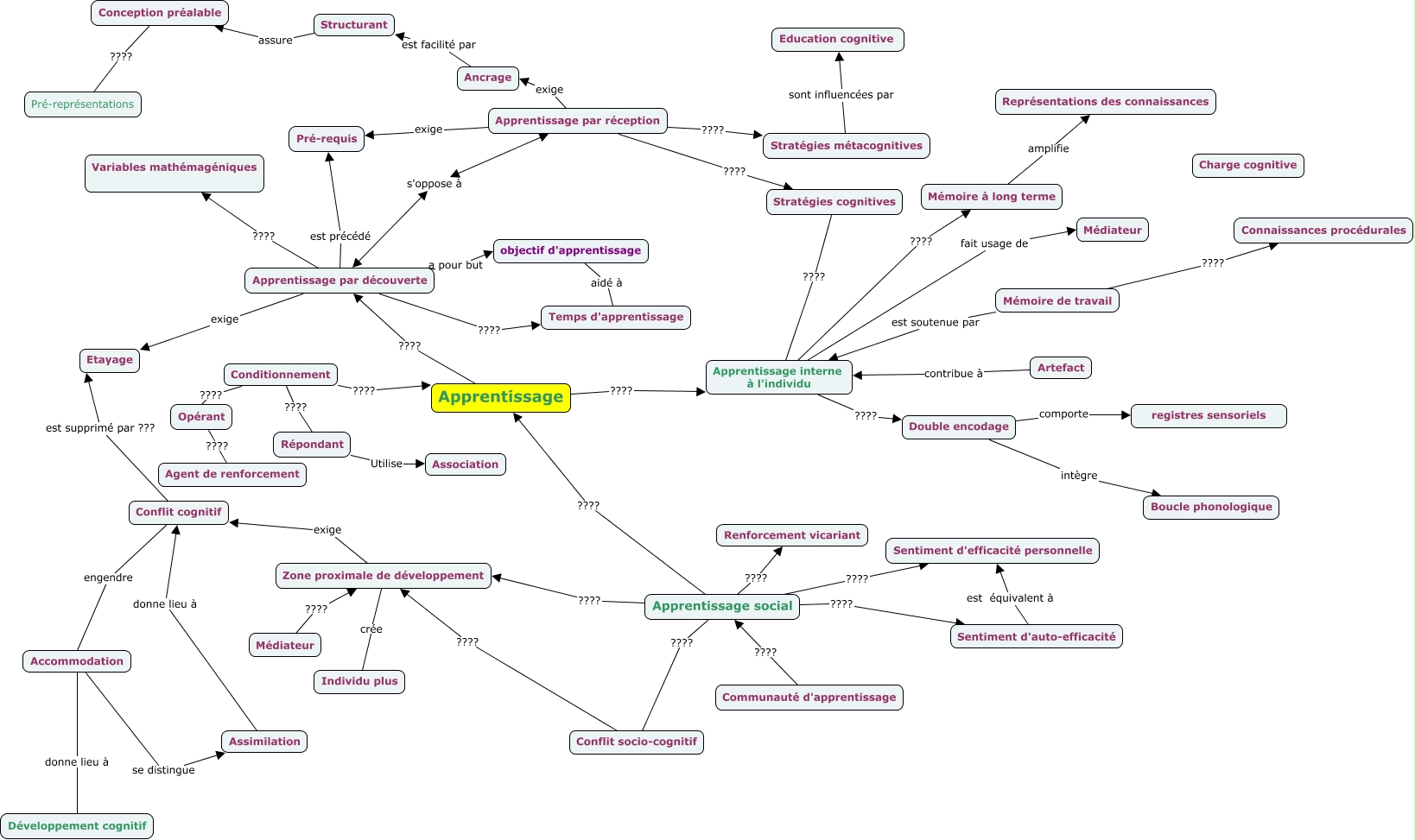 Cette carte de concepts créée avec IHMC CmapTools traite de: Sc de l'éducation, Médiateur ???? Zone proximale de développement, Accommodation se distingue Assimilation, Apprentissage par découverte a pour but objectif d'apprentissage, Apprentissage par découverte exige Etayage, Artefact contribue à Apprentissage interne à l'individu, Apprentissage ???? Apprentissage interne à l'individu, Apprentissage ???? Apprentissage par découverte, Apprentissage social ???? Zone proximale de développement, Mémoire de travail est soutenue par Apprentissage interne à l'individu, Double encodage comporte registres sensoriels, Conception préalable ???? Pré-représentations, Apprentissage par découverte s'oppose à Apprentissage par réception, Conditionnement ???? Répondant, Apprentissage social ???? Sentiment d'auto-efficacité, Apprentissage interne à l'individu fait usage de Médiateur, Apprentissage par découverte ???? Variables mathémagéniques, Stratégies métacognitives sont influencées par Education cognitive, Répondant Utilise Association, Opérant ???? Agent de renforcement, Ancrage est facilité par Structurant