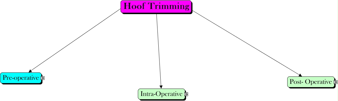 This Concept Map, created with IHMC CmapTools, has information related to: Hoof trimming, Intra-Operative Considerations Associated (scroll over), Hoof Trimming ???? Post- Operative, Hoof Trimming ???? Pre-operative, Intra-Operative Aim, Intra-Operative Technique/Procedure, Intra-Operative Equipment (scroll over), Hoof Trimming Intra-Operative, Intra-Operative Use (scroll over)