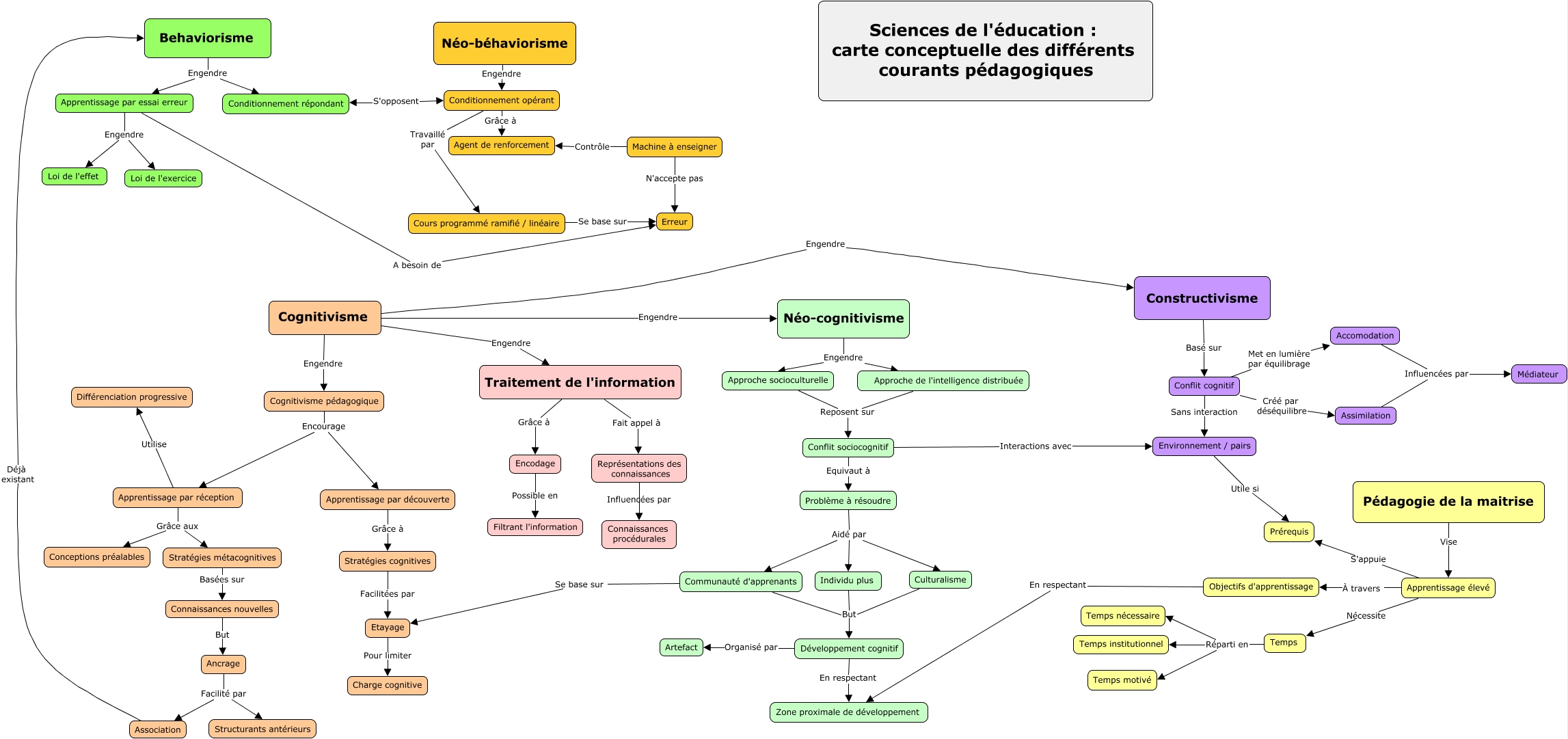 Cette carte de concepts créée avec IHMC CmapTools traite de: carte finale, Apprentissage par essai erreur Engendre Loi de l'effet, Approche socioculturelle Reposent sur Approche de l'intelligence distribuée, Cognitivisme Engendre Néo-cognitivisme, Behaviorisme Engendre Apprentissage par essai erreur, Problème à résoudre Aidé par Individu plus, Connaissances nouvelles But Ancrage, Temps Réparti en Temps nécessaire, Constructivisme Basé sur Conflit cognitif, Apprentissage par réception Grâce aux Conceptions préalables, Traitement de l'information Grâce à Encodage, Approche socioculturelle Reposent sur Conflit sociocognitif, Apprentissage par réception Utilise Différenciation progressive, Ancrage Facilité par Association, Développement cognitif En respectant Zone proximale de développement, Environnement / pairs Utile si Prérequis, Machine à enseigner Contrôle Agent de renforcement, Encodage Possible en Filtrant l'information, Association Déjà existant Behaviorisme, Behaviorisme Engendre Conditionnement répondant, Néo-cognitivisme Engendre Approche de l'intelligence distribuée
