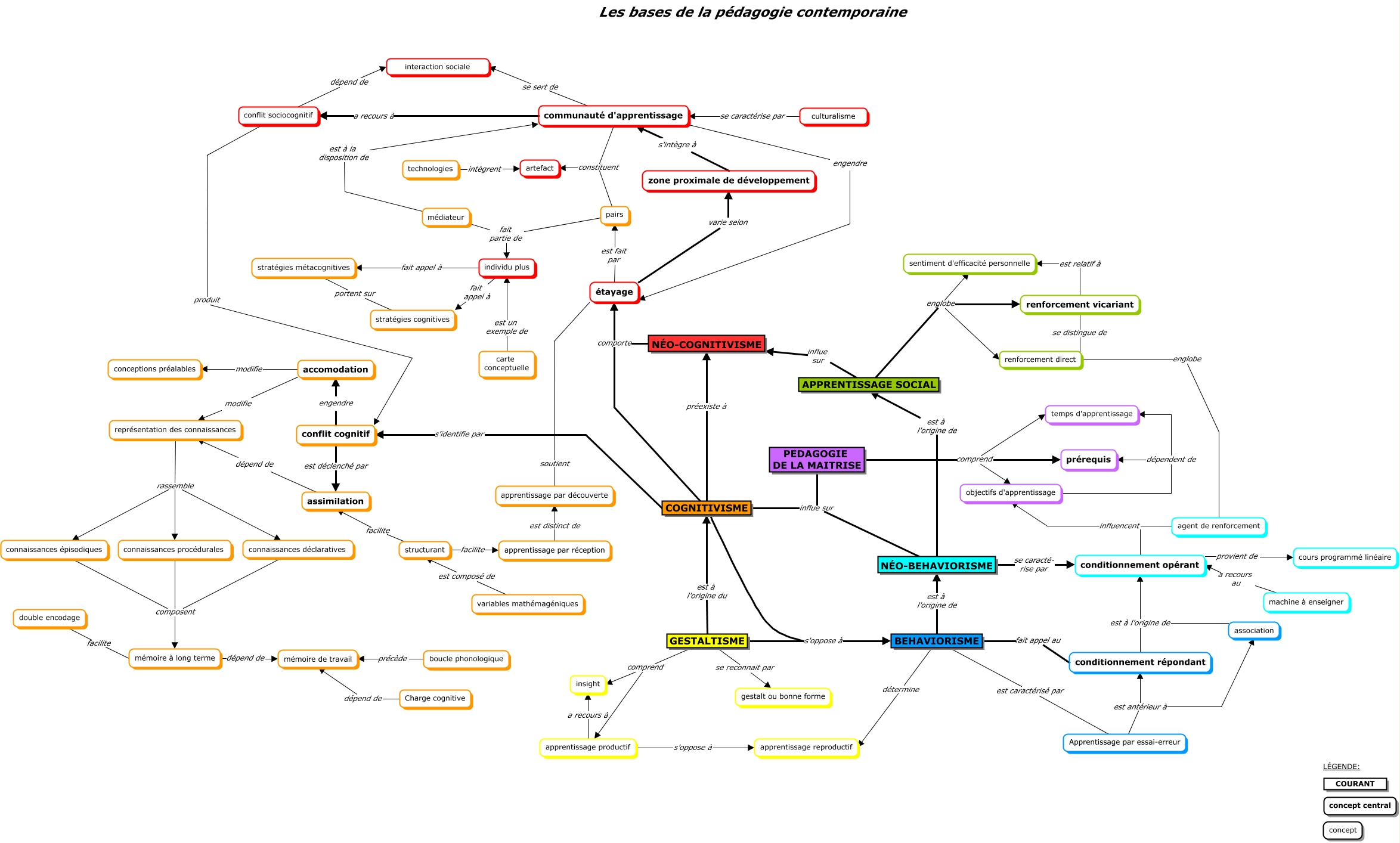 Dieses mit IHMC CmapTools erstellte CMap hat Informationen bezüglich: carte collaborative 07 G13, apprentissage productif a recours à insight, APPRENTISSAGE SOCIAL influe sur NÉO-COGNITIVISME, médiateur est à la disposition de communauté d'apprentissage, structurant facilite assimilation, NÉO-BEHAVIORISME influe sur PEDAGOGIE DE LA MAITRISE, GESTALTISME est à l'origine du COGNITIVISME, PEDAGOGIE DE LA MAITRISE comprend prérequis, individu plus fait appel à stratégies métacognitives, GESTALTISME comprend insight, communauté d'apprentissage se sert de interaction sociale, apprentissage productif s'oppose à apprentissage reproductif, agent de renforcement influencent objectifs d'apprentissage, pairs constituent communauté d'apprentissage, structurant facilite apprentissage par réception, conflit cognitif est déclenché par assimilation, pairs constituent artefact, pairs fait partie de individu plus, technologies intègrent artefact, BEHAVIORISME est à l'origine de NÉO-BEHAVIORISME, stratégies métacognitives portent sur stratégies cognitives