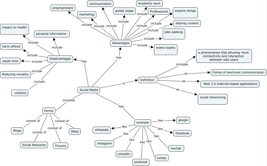 This Concept Map, created with IHMC CmapTools, has information related to: socialmedia_1, Advantages include global usage, Social Media has example, Definition as Forms of electronic communication, Disadvantages include Reducing morality, Definition as social networking, example like twitter, Advantages include Academic work, Definition as Web 2.0 Internet-based applications, Definition includes a phenomenon that allowing more connectivity and interaction between web users, Social Media has Advantages, Advantages include sharing content, Advantages include marketing, example like instagram, example like wikipedia, Advantages include entertainment, example like LinkedIn, Disadvantages include violence, Forms consist of Forums, Forms consist of Social Networks, Forms consist of Wikis