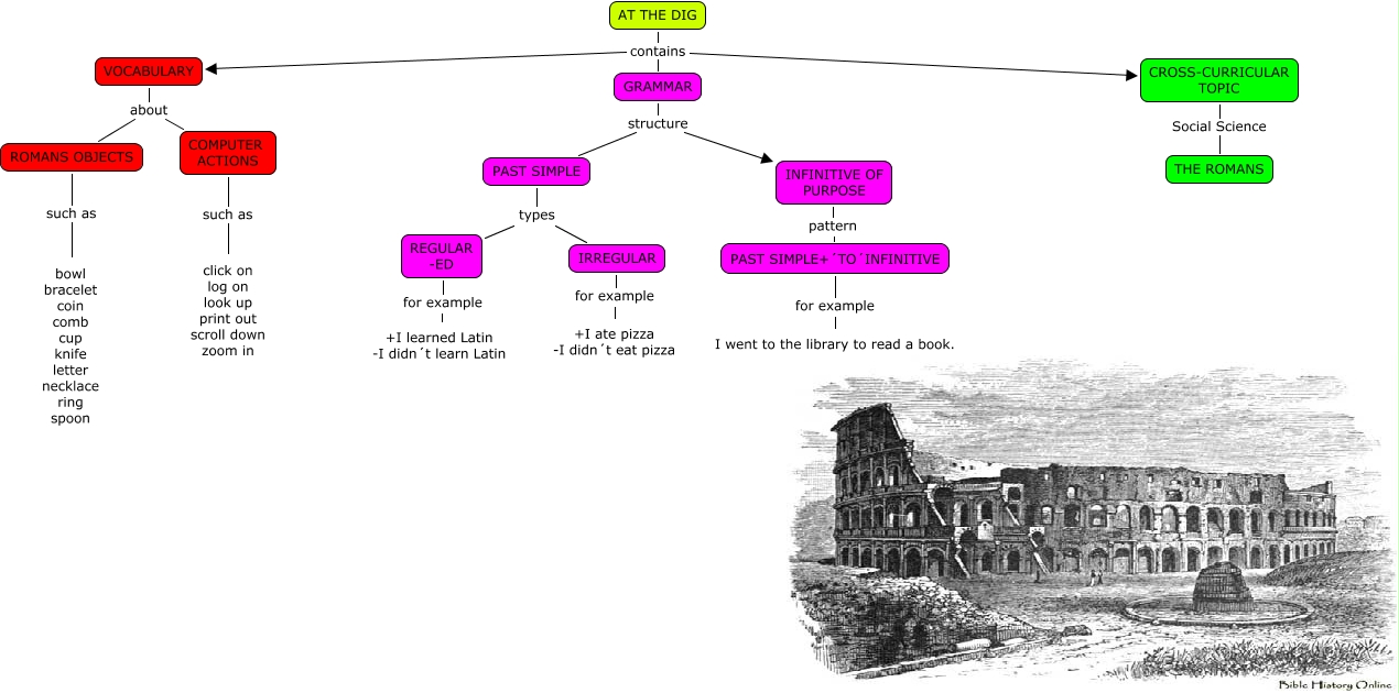 Este Cmap, tiene información relacionada con: AT THE DIG_Unax y Santiago, PAST SIMPLE+´TO´INFINITIVE for example I went to the library to read a book., CROSS-CURRICULAR TOPIC Social Science THE ROMANS, ROMANS OBJECTS such as bowl bracelet coin comb cup knife letter necklace ring spoon, GRAMMAR structure PAST SIMPLE, REGULAR -ED for example +I learned Latin -I didn´t learn Latin, PAST SIMPLE types IRREGULAR, GRAMMAR structure INFINITIVE OF PURPOSE, AT THE DIG contains VOCABULARY, COMPUTER ACTIONS such as click on log on look up print out scroll down zoom in, INFINITIVE OF PURPOSE pattern PAST SIMPLE+´TO´INFINITIVE, PAST SIMPLE types REGULAR -ED, AT THE DIG contains CROSS-CURRICULAR TOPIC, VOCABULARY about ROMANS OBJECTS, AT THE DIG contains GRAMMAR, IRREGULAR for example +I ate pizza -I didn´t eat pizza, VOCABULARY about COMPUTER ACTIONS