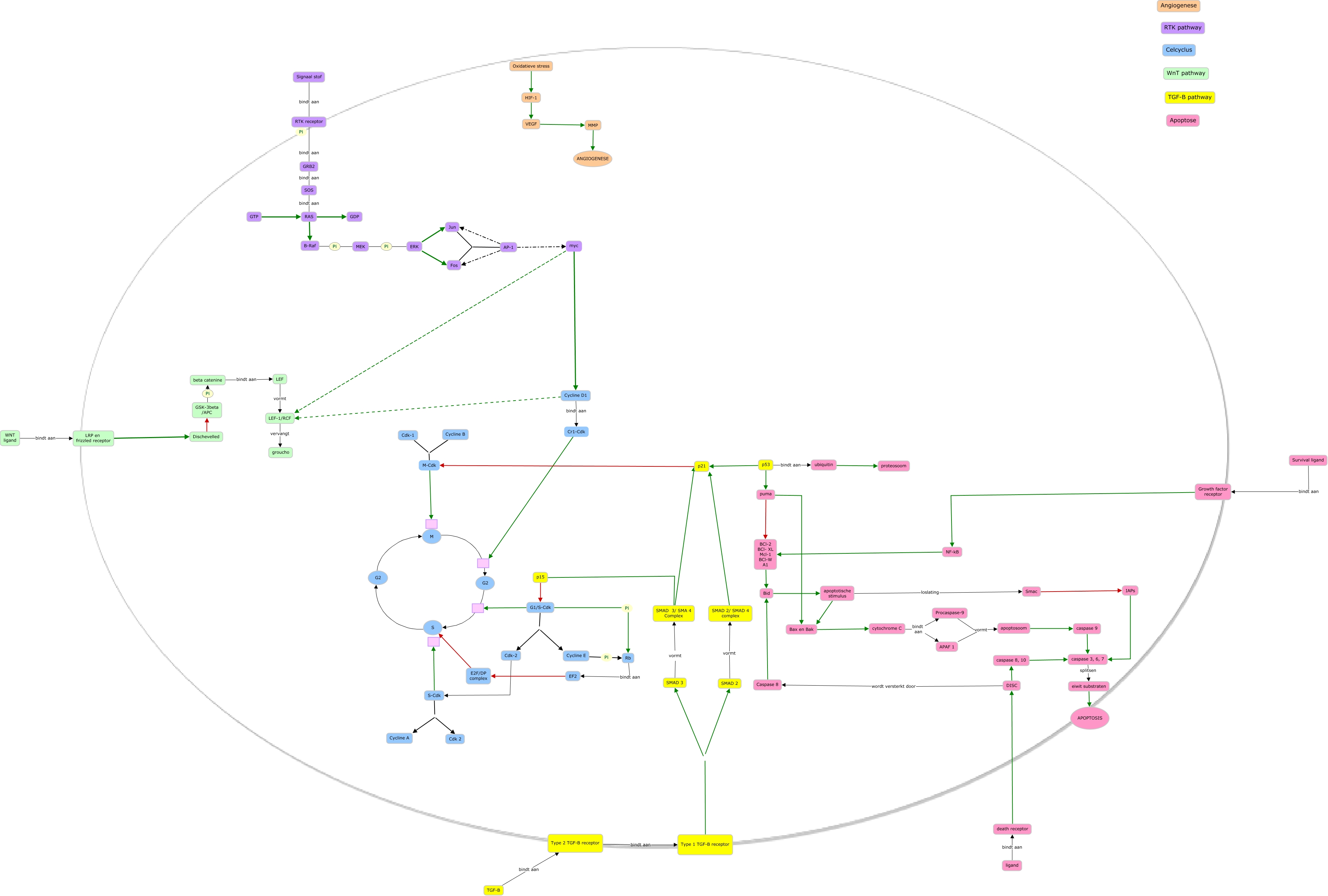 Deze Concept Map heeft informatie gerelateerd aan: Kopieer 2 van CMAP totaal versie 1, AP-1 myc, B-Raf Pi, SMAD 3 vormt SMAD 3/ SMA 4 Complex, Smac IAPs, GTP RAS, Type 1 TGF-B receptor SMAD 2, G2 M, Caspase 8 Bid, p21 M-Cdk, Bid apoptotische stimulus, S-Cdk, apoptotische stimulus Bax en Bak, death receptor DISC, p53 p21, MEK Pi, Cdk-1 M-Cdk, puma Bax en Bak, AP-1 Jun, Cr1-Cdk, G2 S