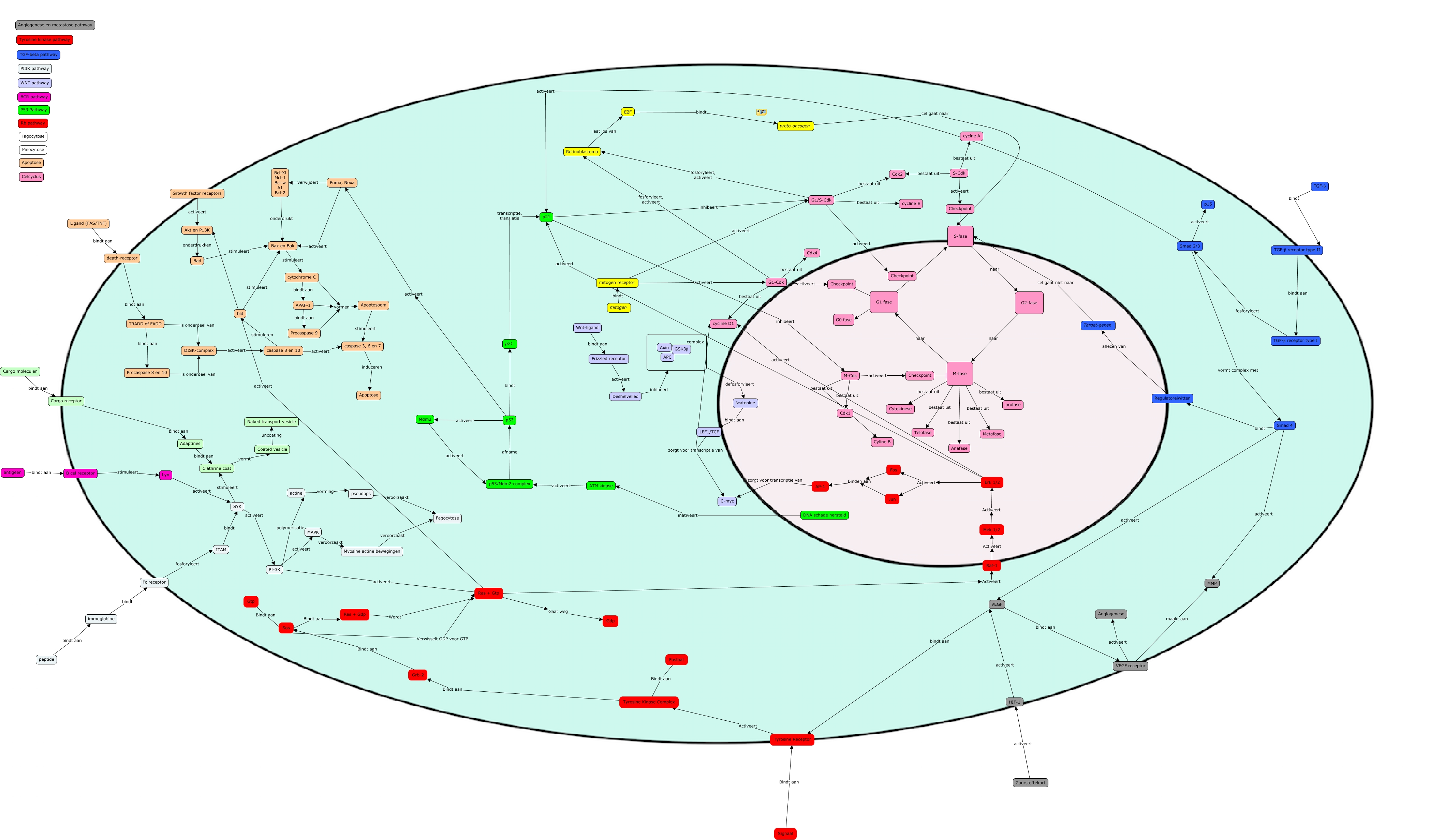 Deze Concept Map heeft informatie gerelateerd aan: Cmap 2.0, Puma, Noxa verwijdert Bcl-Xl Mcl-1 Bcl-w A1 Bcl-2, Cargo receptor bindt aan Adaptines, Wnt-ligand bindt aan Frizzled receptor, Deshelvelled inhibeert complex, Clathrine coat vormt Coated vesicle, immuglobine bindt Fc receptor, Tyrosine Receptor Activeert Tyrosine Kinase Complex, G1-Cdk bestaat uit cycline D1, Fc receptor fosforyleert ITAM, Ras + Gtp Gaat weg Gdp, Checkpoint G1 fase, G1-Cdk fosforyleert, activeert Retinoblastoma, Signaal Bindt aan Tyrosine Receptor, Sos Bindt aan Ras + Gdp, proto-oncogen cel gaat naar S-fase, p21 inhibeert G1/S-Cdk, Target-genen cel gaat niet naar S-fase, mitogen receptor activeert G1-Cdk, Smad 4 bindt Regulatoreiwitten, Erk 1/2 Activeert Jun