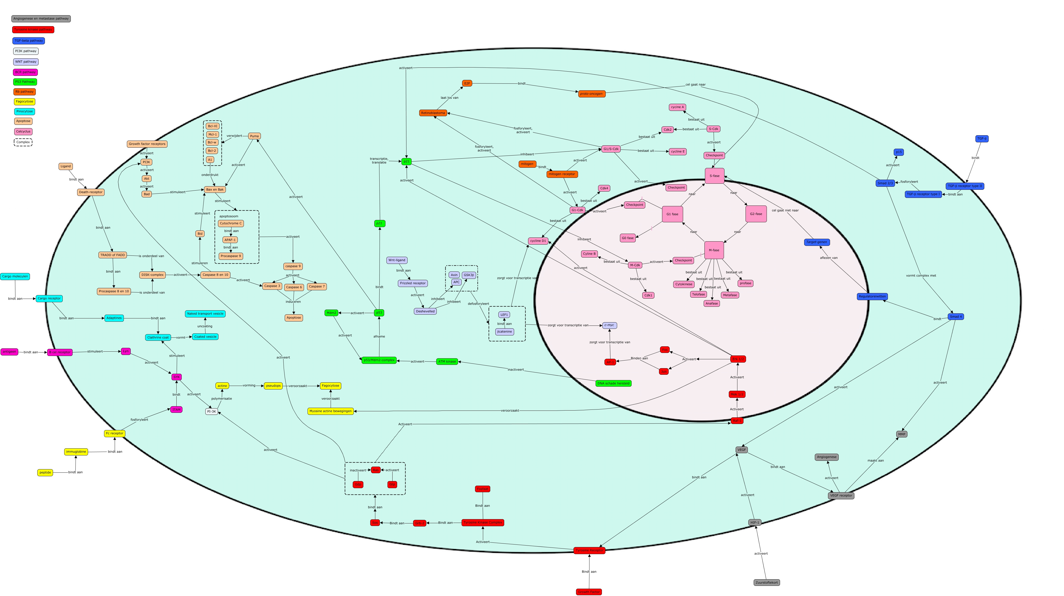 Deze Concept Map heeft informatie gerelateerd aan: Cmap goeie!!, pseudops veroorzaakt Fagocytose, G1/S-Cdk activeert Checkpoint, A1 onderdrukt Bax en Bak, p53 activeert Puma, HIF-1 activeert VEGF, S-Cdk bestaat uit cycine A, Puma verwijdert, mitogen receptor activeert G1/S-Cdk, mitogen receptor activeert G1-Cdk, Gtp activeert Ras, G1-Cdk activeert Checkpoint, activeert PI3K, peptide bindt aan immuglobine, G1/S-Cdk bestaat uit Cdk2, S-Cdk activeert Checkpoint, p21 inhibeert G1/S-Cdk, Puma activeert Bax en Bak, ITAM bindt SYK, Raf-1 Activeert Mek 1/2, Cargo receptor bindt aan Adaptines