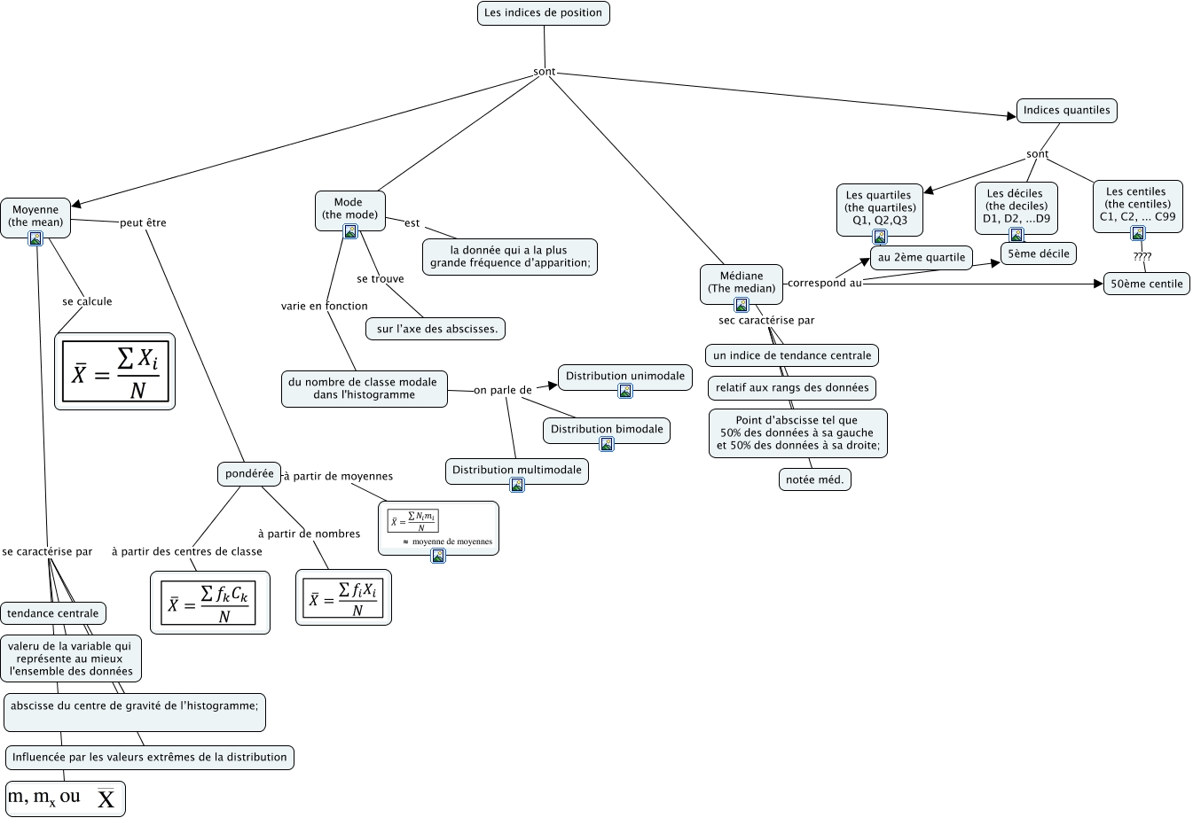 Cette carte de concepts créée avec IHMC CmapTools traite de: Caractériser l'ensemble des données numériques par une valeur numérique, Les indices de position sont Moyenne (the mean), Les quartiles (the quartiles) Q1, Q2,Q3 ???? au 2ème quartile, Médiane (The median) correspond au 5ème décile, Les déciles (the deciles) D1, D2, ...D9 ???? 5ème décile, Indices quantiles sont Les quartiles (the quartiles) Q1, Q2,Q3, Médiane (The median) sec caractérise par relatif aux rangs des données, Moyenne (the mean) se caractérise par valeru de la variable qui représente au mieux l'ensemble des données, Les indices de position sont Mode (the mode), Moyenne (the mean) se caractérise par tendance centrale, pondérée à partir des centres de classe, Les indices de position sont Indices quantiles, Indices quantiles sont Les centiles (the centiles) C1, C2, ... C99, Mode (the mode) est la donnée qui a la plus grande fréquence d’apparition;, Moyenne (the mean) se caractérise par Influencée par les valeurs extrêmes de la distribution, Mode (the mode) se trouve sur l’axe des abscisses., du nombre de classe modale dans l'histogramme on parle de Distribution unimodale, Moyenne (the mean) se caractérise par, du nombre de classe modale dans l'histogramme on parle de Distribution multimodale, Médiane (The median) correspond au au 2ème quartile, Médiane (The median) sec caractérise par un indice de tendance centrale