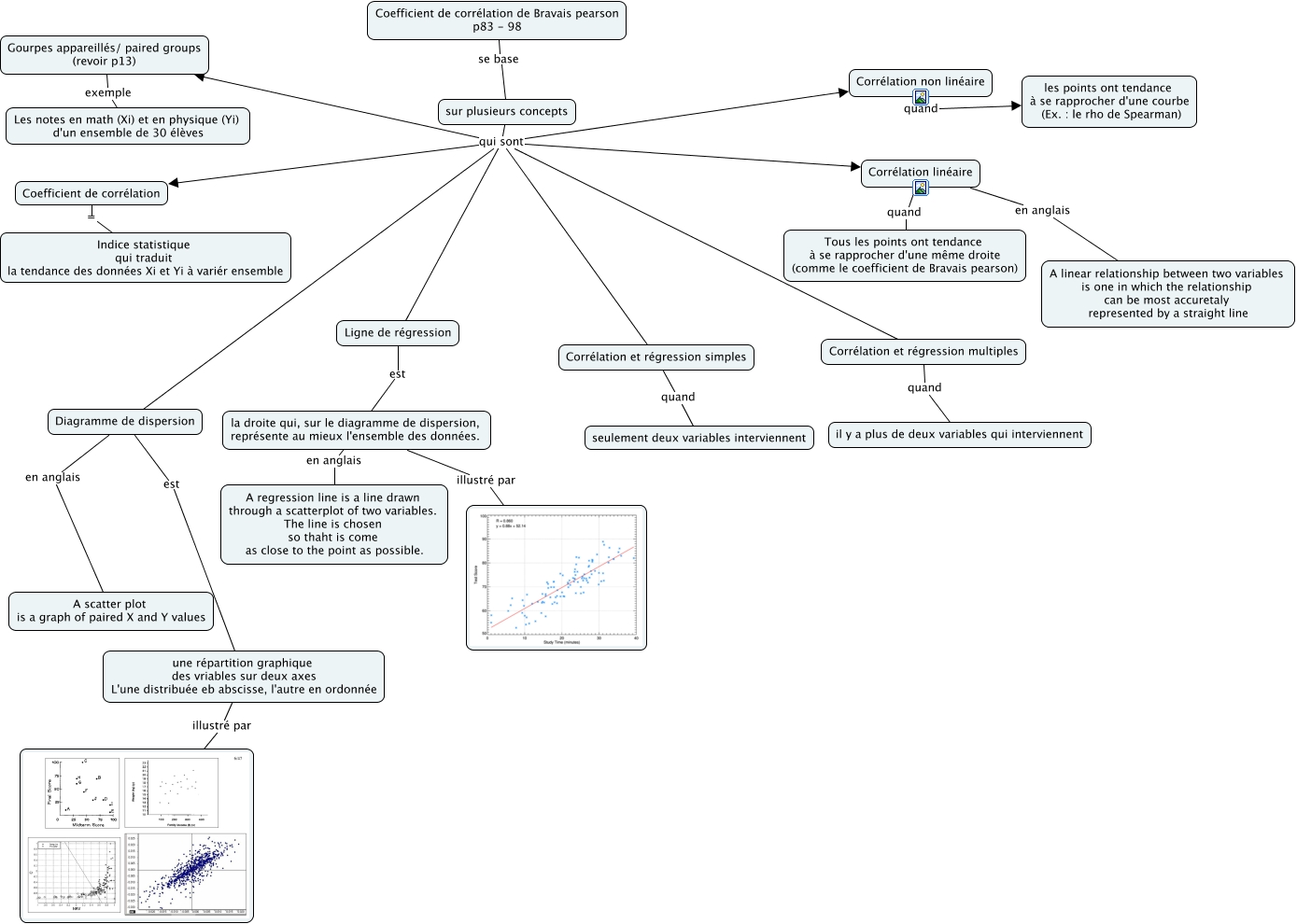 Cette carte de concepts créée avec IHMC CmapTools traite de: 2.6.1 le coefficient de corrélation de Bravais-pearson - concept de base, Corrélation et régression multiples quand il y a plus de deux variables qui interviennent, Diagramme de dispersion en anglais A scatter plot is a graph of paired X and Y values, la droite qui, sur le diagramme de dispersion, représente au mieux l'ensemble des données. en anglais A regression line is a line drawn through a scatterplot of two variables. The line is chosen so thaht is come as close to the point as possible., sur plusieurs concepts qui sont Coefficient de corrélation, sur plusieurs concepts qui sont Corrélation linéaire, Corrélation non linéaire quand les points ont tendance à se rapprocher d'une courbe (Ex. : le rho de Spearman), Ligne de régression est la droite qui, sur le diagramme de dispersion, représente au mieux l'ensemble des données., sur plusieurs concepts qui sont Gourpes appareillés/ paired groups (revoir p13), Corrélation linéaire en anglais A linear relationship between two variables is one in which the relationship can be most accuretaly represented by a straight line, Coefficient de corrélation de Bravais pearson p83 - 98 se base sur plusieurs concepts, sur plusieurs concepts qui sont Corrélation et régression simples, Diagramme de dispersion est une répartition graphique des vriables sur deux axes L'une distribuée eb abscisse, l'autre en ordonnée, Corrélation et régression simples quand seulement deux variables interviennent, Corrélation linéaire quand Tous les points ont tendance à se rapprocher d'une même droite (comme le coefficient de Bravais pearson), sur plusieurs concepts qui sont Corrélation et régression multiples, sur plusieurs concepts qui sont Ligne de régression, une répartition graphique des vriables sur deux axes L'une distribuée eb abscisse, l'autre en ordonnée illustré par, Gourpes appareillés/ paired groups (revoir p13) exemple Les notes en math (Xi) et en physique (Yi) d'un ensemble de 30 élèves, sur plusieurs concepts qui sont Diagramme de dispersion, la droite qui, sur le diagramme de dispersion, représente au mieux l'ensemble des données. illustré par