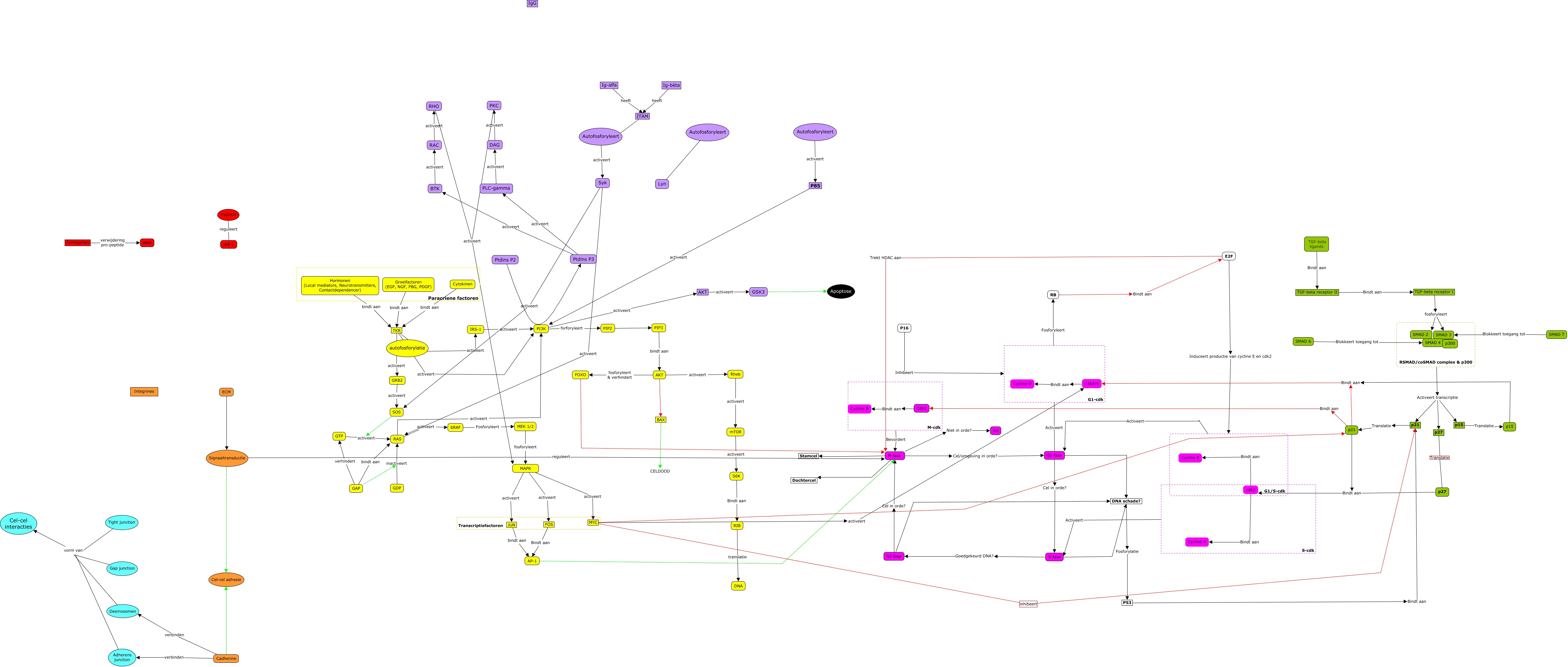Deze Concept Map heeft informatie gerelateerd aan: Nieuwe versie, G1-cdk Activeert G1-fase, Ig-bèta heeft ITAM, Hypoxie reguleert HIF-1, SMAD 6 Blokkeert toegang tot SMAD 4, RB Bindt aan E2F, P53 Bindt aan p21, AKT fosforyleert & verhindert FOXO, TGF-beta receptor II Bindt aan TGF-beta receptor I, M-fase Niet in orde? G0, Autofosforyleert activeert Syk, Desmosomen vorm van Cel-cel interacties, Ptdins P3 activeert PLC-gamma, mTOR activeert S6K, MAPK activeert FOS, MEK 1/2 fosforyleert MAPK, Ptdins P3 activeert BTK, S-cdk Activeert S-fase, TKR activeert PI3K, RSMAD/coSMAD complex & p300 Activeert transcriptie p15, p27 Bindt aan cdk2