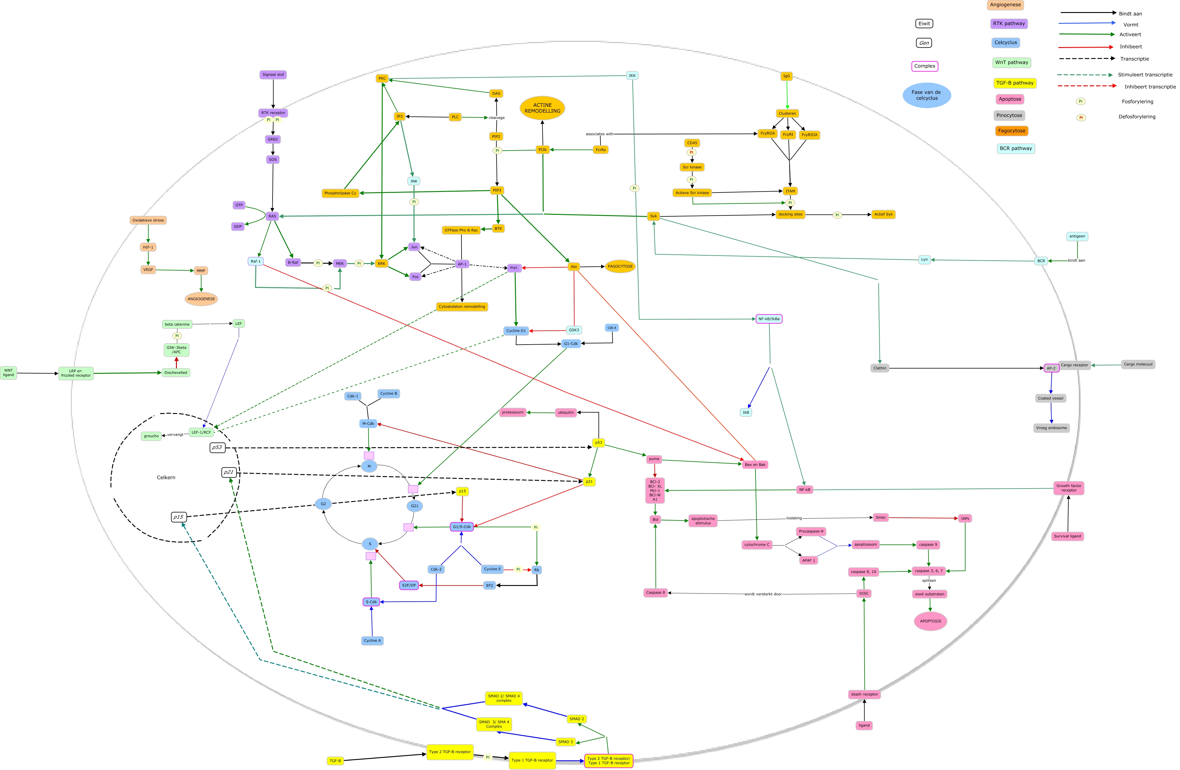 Deze Concept Map heeft informatie gerelateerd aan: CMAP totaal versie 1 met celkern en legenda, p15 G1/S-Cdk, IAPs caspase 3, 6, 7, Akt Bax en Bak, GSK3 Cycline D1, M G21, Type 2 TGF-B receptor/ Type 1 TGF-B receptor SMAD 2, Cycline E Rb, p53 ubiquitin, Akt GSK3, Syk Clathin, IKK NF-kB/IkBa, p21 M-Cdk, death receptor DISC, cytochrome C APAF 1,, p15, SMAD 3 SMAD 3/ SMA 4 Complex, Cycline B M-Cdk, AP-1 Fos, PIP2 cleavage DAG