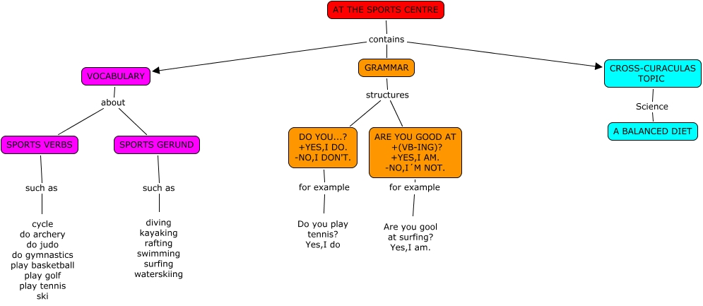 Este Cmap, tiene información relacionada con: AT THE SPORTS CENTRE GUILLERMO P, GUILLERMO D Y DEBORA, AT THE SPORTS CENTRE contains VOCABULARY, ARE YOU GOOD AT +(VB-ING)? +YES,I AM. -NO,I´M NOT. for example Are you gool at surfing? Yes,I am., AT THE SPORTS CENTRE contains GRAMMAR, SPORTS VERBS such as cycle do archery do judo do gymnastics play basketball play golf play tennis ski, DO YOU...? +YES,I DO. -NO,I DON'T. for example Do you play tennis? Yes,I do, GRAMMAR structures DO YOU...? +YES,I DO. -NO,I DON'T., AT THE SPORTS CENTRE contains CROSS-CURACULAS TOPIC, GRAMMAR structures ARE YOU GOOD AT +(VB-ING)? +YES,I AM. -NO,I´M NOT., CROSS-CURACULAS TOPIC Science A BALANCED DIET, VOCABULARY about SPORTS GERUND, VOCABULARY about SPORTS VERBS, SPORTS GERUND such as diving kayaking rafting swimming surfing waterskiing