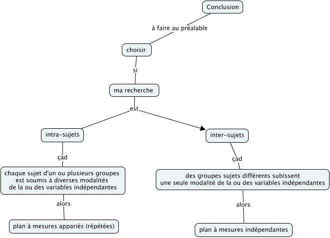 Cette carte de concepts créée avec IHMC CmapTools traite de: conclusion pour les plans expérimentaux, des groupes sujets différents subissent une seule modalité de la ou des variables indépendantes alors plan à mesures indépendantes, ma recherche est inter-sujets, inter-sujets çàd des groupes sujets différents subissent une seule modalité de la ou des variables indépendantes, Conclusion à faire au préalable choisir, chaque sujet d'un ou plusieurs groupes est soumis à diverses modalités de la ou des variables indépendantes alors plan à mesures appariés (répétées), ma recherche est intra-sujets, choisir si ma recherche, intra-sujets çàd chaque sujet d'un ou plusieurs groupes est soumis à diverses modalités de la ou des variables indépendantes