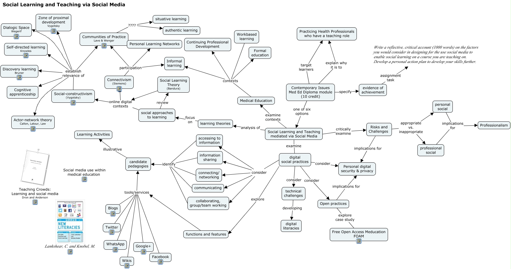 This Concept Map, created with IHMC CmapTools, has information related to: Social Learning and Teaching via Social Media, Social Learning and Teaching mediated via Social Media examine digital social practices, Contemporary Issues Med Ed Diploma module (10 credit) specify evidence of achievement, Medical Education contexts Workbased learning, candidate pedagogies illustrative Learning Activities, Contemporary Issues Med Ed Diploma module (10 credit) one of six options Social Learning and Teaching mediated via Social Media, digital social practices consider Personal digital security & privacy, Social-constructivism (Vygotsky) establish relevance of Self-directed learning Knowles, evidence of achievement assignment task Write a reflective, critical account (1000 words) on the factors you would consider in designing for the use social media to enable social learning on a course you are teaching on. Develop a personal action plan to develop your skills further., Social Learning Theory (Bandura) online digital contexts Connectivism (Siemens), information sharing identify candidate pedagogies, learning theories focus on social approaches to learning, functions and features tools/services Blogs, Social Learning and Teaching mediated via Social Media critically examine Risks and Challenges, Communities of Practice Lave & Wenger ???? situative learning, Open practices explore case study Free Open Access Meducation FOAM, Social Learning Theory (Bandura) online digital contexts Social-constructivism (Vygotsky), digital social practices explore functions and features, connecting/ networking identify candidate pedagogies, Social-constructivism (Vygotsky) establish relevance of Zone of proximal development Vygotsky, functions and features tools/services Facebook