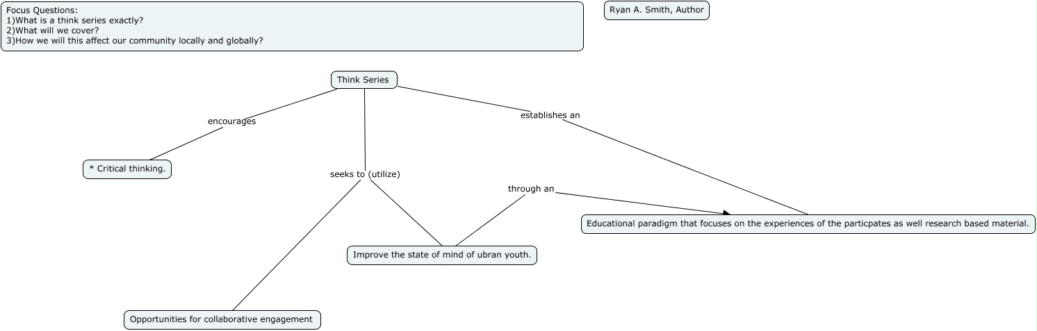 This Concept Map, created with IHMC CmapTools, has information related to: HLLC- Rutgers University Newark Think Series, Think Series establishes an Educational paradigm that focuses on the experiences of the particpates as well research based material., Think Series seeks to (utilize) Improve the state of mind of ubran youth., Think Series seeks to (utilize) Opportunities for collaborative engagement, Think Series encourages * Critical thinking., Improve the state of mind of ubran youth. through an Educational paradigm that focuses on the experiences of the particpates as well research based material.