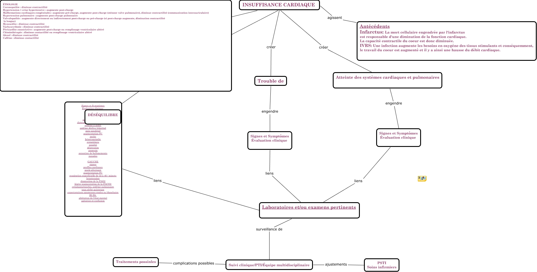Cette carte de concepts créée avec IHMC CmapTools traite de: Insuffisance cardiaque, Trouble de créer INSUFFISANCE CARDIAQUE, Suivi clinique/PTI/Équipe multidisciplinaire complications possibles Traitements possinles, Laboratoires et/ou examens pertinents surveillance de Suivi clinique/PTI/Équipe multidisciplinaire, Signes et Symptômes Évaluation clinique DROIT signes souffles cardiaques distension veineuse jugulaire oedème à godet oedème déclive bilatéral gain pondéral augmentation FC ascite hépatomégalie symptômes anxiété dépression anorexie sensation de ballonements nausées GAUCHE signes souffles cardiques pouls alternant augmentation FC respiration superficielle de 32 à 40 / minute hypotension diminution de la PAO2 légére augmentation de la PACO2 crépitants/ronchis, oedème pulmonaire toux sèche quinteuse expectorations spumeuses rosées ou blanchatre B3 B4 altération de l'état mental agitation et confusion engendre/démontrer par DÉSÉQUILIBRE, Atteinte des systèmes cardiaques et pulmonaires créer INSUFFISANCE CARDIAQUE, Atteinte des systèmes cardiaques et pulmonaires engendre Signes et Symptômes Évaluation clinique, Laboratoires et/ou examens pertinents liens Signes et Symptômes Évaluation clinique, Antécédents Infarctus: La mort cellulaire engendrée par l'infarctus est responsable d'une diminution de la fonction cardiaque. La capacité contractile du coeur est donc diminuée. IVRS: Une infection augmente les besoins en oxygène des tissus stimulants et conséquemment, le travail du coeur est augmenté et il y a ainsi une hausse du débit cardiaque. agissent INSUFFISANCE CARDIAQUE, Signes et Symptômes Évaluation clinique DROIT signes souffles cardiaques distension veineuse jugulaire oedème à godet oedème déclive bilatéral gain pondéral augmentation FC ascite hépatomégalie symptômes anxiété dépression anorexie sensation de ballonements nausées GAUCHE signes souffles cardiques pouls alternant augmentation FC respiration superficielle de 32 à 40 / minute hypotension diminution de la PAO2 légére augmentation de la PACO2 crépitants/ronchis, oedème pulmonaire toux sèche quinteuse expectorations spumeuses rosées ou blanchatre B3 B4 altération de l'état mental agitation et confusion liens Laboratoires et/ou examens pertinents, INSUFFISANCE CARDIAQUE actions sur le coeur ÉTIOLOGIE Coronopathie : diminue contractilité Hypertension + crise hypertensive : augmente post-charge Malformations cardiaques congénitales : augmente pré-charge, augmente post-charge (sténose valve pulmonaire), diminue contractilité (communication interauriculaire) Hypertension pulmonaire : augmente post-charge pulmonaire Valvulopathie : augmente directement ou indirectement post-charge ou pré-charge (si post-charge augmente, diminution contractilité la longue) Myocardite : diminue contractilité Tachyarythmie : diminue contractilité Péricardite constrictive : augmente post-charge ou remplissage ventriculaire altéré Chimiothérapie : diminue contactilité ou remplissage ventriculaire altéré Alcool : diminue contractilité Caféine : diminue contactilité, DÉSÉQUILIBRE créer INSUFFISANCE CARDIAQUE, Signes et Symptômes Évaluation clinique engendre Trouble de, Suivi clinique/PTI/Équipe multidisciplinaire ajustements PSTI Soins infirmiers